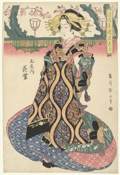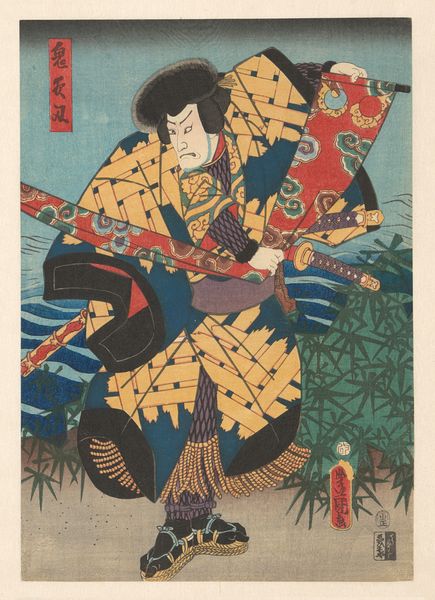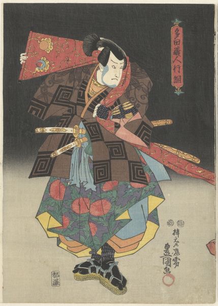 Utagawa Kunisada created 'The Actor', a woodblock print, sometime before his death in 1865. Immediately, we are drawn to the patterned robes and dramatic expression of the figure. The stark contrast between the dark garments and the light blossoms creates a visually striking effect. Consider how the artist plays with surface and depth here. The intricate patterns on the actor's robes flatten the figure, challenging traditional notions of three-dimensionality in art. This flattening effect is characteristic of ukiyo-e prints, which often emphasize decorative design over realistic representation. The sword divides the pictorial space, acting as a structural element that underscores the tension between stasis and action. The actor’s intense gaze and the sword suggest a narrative frozen in time. This work destabilizes the boundary between performance and reality. Kunisada uses form to question the very nature of representation.