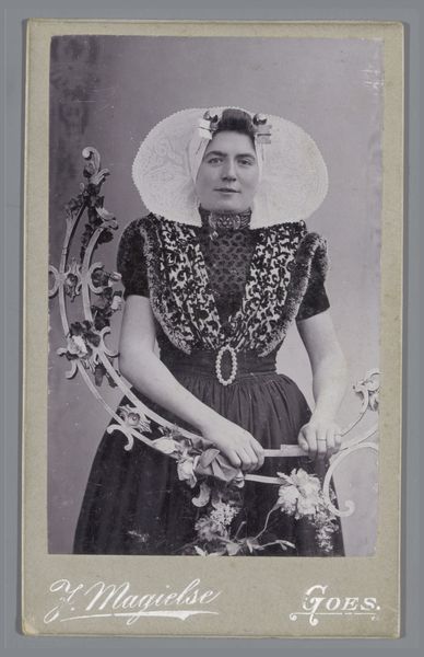 Editor: This photograph by Johannes Gerard Middendorp, titled "Portrait of an Unknown Woman with a Hat, Standing Behind a Balustrade" dates from between 1900 and 1920. I find the subject’s direct gaze and elaborate attire quite captivating. How do you interpret this work within its historical context? Curator: This portrait is a fascinating window into the era. The woman's attire speaks volumes about the social constraints and expectations placed upon women at the turn of the century. Consider the restrictive corset and the elaborate hat - these were symbols of status and conformity. What does it mean to present such a composed and controlled image, especially during a time of emerging feminist movements? Editor: So you're suggesting that her formal appearance might mask a more complex narrative of female identity? Curator: Exactly! Photography itself was becoming more accessible, allowing individuals to craft and disseminate their own image. But this agency was often mediated by societal norms. Look at the balustrade – it's a barrier, both literal and metaphorical. How might we read her position behind it in relation to ideas of confinement or social separation based on gender and class? Editor: That's a powerful point. I hadn't considered how the setting contributes to the overall message about social barriers and the presentation of self. It makes me wonder who this woman was and what her life was like. Curator: Precisely. By examining these visual cues and contextualizing them within broader historical and theoretical frameworks, we can begin to unravel the complex narratives embedded within this seemingly simple portrait. The history of fashion provides insights to understand the nuances of power structures at that time, which shape individual freedoms and contribute to defining selfhood. Editor: I see the portrait with fresh eyes. Thank you for showing me how to view a work like this by recognizing cultural constructs that existed back then. Curator: The photograph prompts us to interrogate the performance of identity, the impact of social structures, and how art preserves not just likeness but broader stories that deserve exploration.