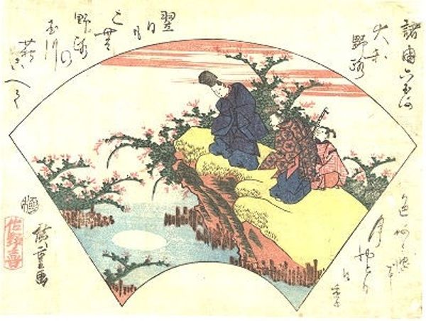 Editor: This is Utagawa Hiroshige's "Tokaido, Gathering Sea-Weed at Omori-Shinagawa." It's so serene, like a little window into a peaceful world. What do you make of the composition? Curator: Serene is the perfect word! I think it captures the quiet dignity of labor. The heart-shaped border almost feels like we're peeking in on an intimate moment, wouldn't you agree? Editor: I hadn't thought of it that way, but I see what you mean. Curator: Hiroshige turns the mundane into something deeply beautiful, doesn't he? Editor: Definitely. I'll remember that. Curator: It makes you wonder about the women gathering seaweed and appreciate their hard work!