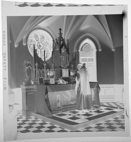 Editor: This photograph by Jack Gould, titled "Untitled (women in veiled costumes giving flower offerings to statue in church)," captures a ceremony of sorts. What symbols or recurring visual themes do you observe? Curator: The veiled women immediately evoke a sense of ritual and tradition, a visible sign of modesty and reverence. Consider the flowers as offerings. What cultural memory do they trigger? Is it about renewal, sacrifice, or perhaps a plea for divine intervention? Editor: I hadn't considered the flowers beyond their beauty. So, are you saying that these aren't just pretty props? Curator: Precisely! Think about the statue itself – a maternal figure, perhaps? The act of crowning it with flowers carries a weight of symbolic meaning. Does it represent idealization, supplication, or the cyclical nature of life and faith? Editor: It's amazing how much a single image can hold. Now I feel like I have so much to look for when looking at art!