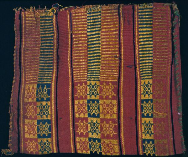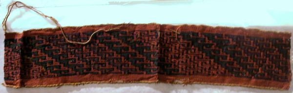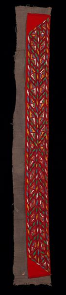 Curator: Looking at this textile fragment, I feel instantly transported... almost like stepping into a forgotten storybook. It's so delicate, yet there’s something quite resilient about its existence through time, you know? Editor: Indeed. This is a textile work entitled "Fragment (Border)" created roughly between 100 and 200 AD, made from weaving by the ancient Nazca culture of Peru. It's a powerful reminder of indigenous innovation predating colonization. Curator: Nazca! That's incredible. The linear geometric designs have this very strong, but subtle pattern, almost hinting at some codified language or message embedded in its repetition. It makes me wonder about the hands that meticulously wove each thread. Were they telling a story, invoking spirits, or perhaps simply finding beauty in pattern itself? Editor: Possibly all those things. Weaving held a significant role within Andean societies; textiles functioned as vital carriers of cultural narratives and social identities. It’s speculated that the elite, through the control of textile production, projected their authority, negotiating societal values and hierarchies. The patterns themselves could represent cosmological beliefs, ancestral lineage, or ritualistic practices specific to the Nazca people. Curator: Right, like the weaving holds worlds. It is exciting to think about, you know? How a single scrap holds so much information and how that info keeps whispering through the ages! Though I can't decipher those patterns literally, it is all very visceral. This piece really calls to a collective, human consciousness. We all look for, crave, symmetry and sense in chaos, don't we? Editor: Yes. While aesthetic appreciation is important, it is paramount to acknowledge that access to and interpretation of such artistry has historically been, and sadly continues to be, defined by systems of power and privilege. Recognizing whose stories get told and how legacies are honored is central to our curatorial responsibilities. Curator: That’s so true. It's humbling to think of this fragment as not just a beautiful piece of cloth but a tangible link to a whole community, carrying whispers of their world through centuries. Editor: Absolutely. These fragmented pieces help us interrogate and re-evaluate the dominant narratives surrounding indigenous artistry, prompting us to reconsider colonial frameworks shaping our comprehension. Curator: That reframing... changes everything about how we engage, how we listen. Thank you. Editor: Indeed, a powerful moment to meditate upon representation, then and now.