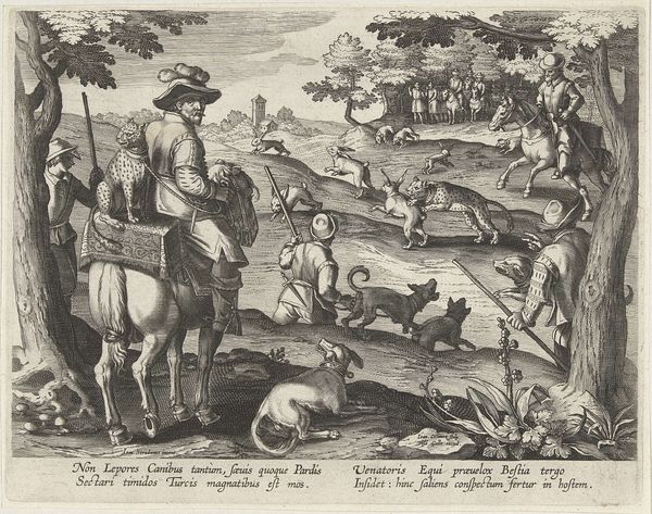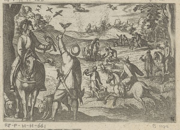 Curator: Ah, here we have “Valkenjacht op reigers en eenden,” or "Falcon Hunting Herons and Ducks" from 1671. An engraving. The dense mark-making used to create the sense of space and figures…what grabs you? Editor: I’m struck by how detailed it is for an engraving. You can almost feel the frenetic energy of the hunt, even the individual feathers on the birds are rendered so carefully. What can you tell me about it? Curator: Notice how the technique itself is put to the service of representing not just the hunt, but the labor and social hierarchy behind it? Consider the process – the metal plate, the tools used to incise the image. How many skilled hands contributed? Where did they source the materials? What purpose would such prints serve? Editor: That's interesting. So, you're saying that even the choice of engraving speaks to the historical context? Curator: Exactly. Engravings like this were often produced in multiples, widely disseminated images for a growing middle class. This artwork, therefore, participates in constructing a new, consumable notion of the natural world and social status, commodifying leisure itself. How is labour reflected in the composition? Editor: Well, the figures on horseback are clearly in charge, while the dogs are doing a lot of the actual work, and, presumably, there are people off-image who trained those dogs. Curator: Precisely! It invites us to think about the relationship between leisure, labour, and consumption. Editor: I hadn't considered it in that way. I was focusing on the artistic skill, but it's fascinating to think about how even the materials and production tell a story about the society that created it. Curator: Art and society cannot be divorced; one impacts the other, and sometimes that dialogue helps uncover deeper meanings.