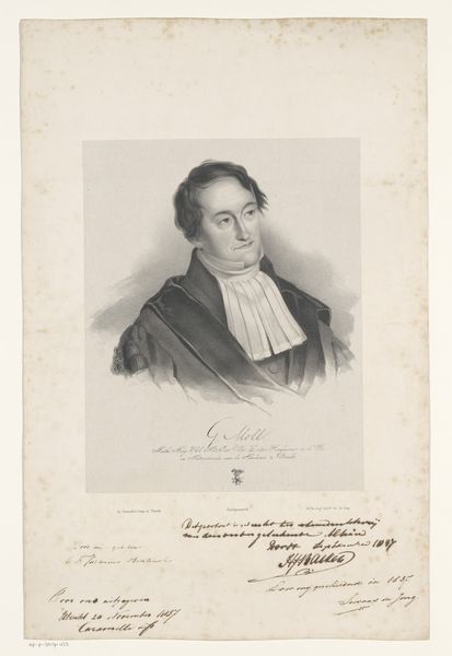 Carel Christiaan Antony Last created this portrait of Adam Simons using lithography. Simons was a man of influence, as a professor, lawyer and judge. Consider the historical context of the 19th century. During this time, social and political identities were often closely tied to profession and status. Last's portrait seems to participate in constructing and solidifying Simons’ public image. Notice the deliberate choices in his attire and posture that signal his position in society, yet there’s a softness in his gaze. Lithography allowed for wider distribution, and this accessibility contributed to shaping public perceptions of figures like Simons. While appearing conventional, Last’s work also subtly humanizes Simons.