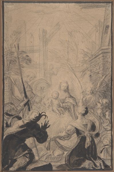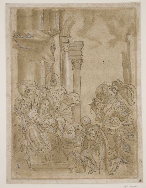Curator: What a striking scene! I immediately feel a weightiness to it, despite the medium being something as simple as pen and ink. The urgency in the figures… Editor: Indeed. What we're looking at here is "Deathbed Scene," an anonymous work rendered in pen and brown ink on paper, dating somewhere between 1600 and 1700. It’s a powerful example of the history painting tradition even within a modest format. Curator: Modest, yes, in size and medium, but grand in ambition. Look at how the artist captures the raw emotion: despair, supplication, maybe even defiance. Is it a historical scene or an allegory? Editor: The drawing utilizes established iconographic motifs around death: the prominent religious figure near the head of the bed perhaps administering last rites, the grieving figure clutching what appears to be a skull... symbols of mortality. Curator: And how that figure with the skull dramatically occupies the foreground! The way he's posed, almost a mirror image of the dying man. The whole composition forces us, the viewers, to confront the finality of life. Where would such a drawing have been viewed at the time? What function would it have served? Editor: Likely this was preparatory, perhaps for a print, given its strong narrative qualities. The piece participates in a discourse on death and morality prominent during that era, a cultural fascination—or perhaps obsession—that was both a consequence and a commentary on disease, warfare, and an understanding of worldly vanity. Its exhibition probably had a didactic goal to elevate the spectator and improve public morals. Curator: Fascinating how an artist, even without a name attached to the work, could harness symbols and gestures to speak volumes. It prompts consideration of mortality across the centuries. Editor: A potent reminder, I think, that regardless of social status, depicted wealth, and privilege, the universality of death remains a leveller throughout history. Curator: Precisely. A stark visual memento mori indeed!