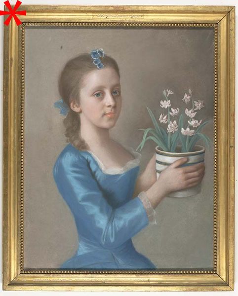 Editor: This is "Young Girl Holding a Pot of Hyacinths," a pastel portrait by Jean-Étienne Liotard, dating from around 1750 to 1755. I'm struck by the delicate colors and the girl's somewhat self-conscious expression. What kind of statement was Liotard making? Curator: A fascinating piece! It operates within the Rococo period's fascination with innocence, but it simultaneously showcases the emerging role of art as a display of social status. The young girl, undoubtedly from a privileged background due to her dress and the leisure activity depicted, is framed holding hyacinths. Editor: The flowers seem so…fragile. Curator: Precisely! Hyacinths, newly fashionable at the time, were cultivated in elaborate, costly Delftware pots. Their inclusion points not only to the family's wealth, displayed with these fashionable and seasonal blooms, but to an awareness of botanical science, something increasingly associated with enlightenment ideals. Editor: So, it’s not just a pretty picture, but also a representation of power and cultural capital? Curator: Exactly. Portraits like these actively participated in constructing a public image of the sitter's family. Think about where such portraits would have been hung, and for whom. Were they designed primarily to impress other members of their social class? How does it shape your viewing knowing these sorts of dynamics were at play? Editor: I never considered how much these domestic objects are involved with social signaling in artwork like this. This makes me see the portrait in a completely new way, with a sharper awareness of the subtle displays of status woven into something that seems, at first glance, just delicate. Curator: The politics of imagery often hide behind seemingly simple subjects! Paying attention to how social contexts intertwine with art broadens our appreciation, even for these seemingly innocent depictions of the wealthy.