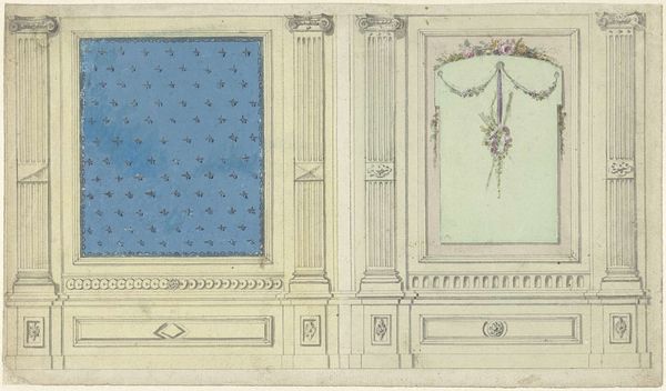 Editor: This is "Ontwerp voor kamerversiering met twee panelen met ornamenten van muziekinstrumenten," a watercolor and ink drawing on paper by Abraham Meertens, dating from 1767 to 1823. It's a study for a room decoration, and what strikes me first is the crispness of the geometric forms and the rather muted palette. How do you approach interpreting this kind of design? Curator: Initially, it is imperative to acknowledge the work's construction; we see primarily two square panels contained within a larger rectangular format. The interplay of these geometric shapes—squares, rectangles, and the circles suggested within the decorative elements—establish a clear visual hierarchy. Have you considered the impact of these shapes on your viewing experience? Editor: Well, the squares create a sense of balance, almost classical harmony, right? Curator: Precisely. The repetition of the square motif creates a sense of order. The strategic deployment of the colour—notice how a subdued green subtly weaves the panels into a cohesive composition—contributes significantly to this formalistic interpretation. Now, turning to the elements, the musical instruments, as structural counterpoints, what of their role? Editor: They seem almost incidental, not really interrupting the rigid geometry but maybe softening it a little? Curator: Yes, I agree. See how these small clusters of objects provide visual interest against the comparatively flatter expanse. It draws the eye and encourages a more studied visual investigation, which gives the wall "movement." This element brings some 'humanness' into what is, from a construction point of view, cold. Editor: I see, so focusing on the form and construction reveals more about the purpose and even the effect of this piece than simply looking at the subject matter. Thanks! Curator: Exactly, sometimes you need to block out context and appreciate a composition based purely on shape. It may not answer all the questions about this painting, but I found this a fascinating and refreshing view.