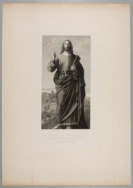 Auguste Thomas Marie Blanchard created this print of "Christus in een versierde lijst." This image reflects the 19th-century European interpretation of Jesus, a figure central to Christian identity and belief. Blanchard, as a printmaker, was part of a tradition that democratized images, making them accessible to a wider audience. The halo and the serene expression conform to established artistic representations of Jesus, which have often served to reinforce religious and cultural norms. Yet, within these conventions, the subtle details—the gentle eyes, the slightly melancholic expression—invite a more personal, emotional connection. Consider how this image might have resonated with viewers of the time, who were navigating their faith in a rapidly changing world. It is an invitation to reflect on the enduring power of images in shaping our understanding of identity, belief, and the stories we tell ourselves about who we are.