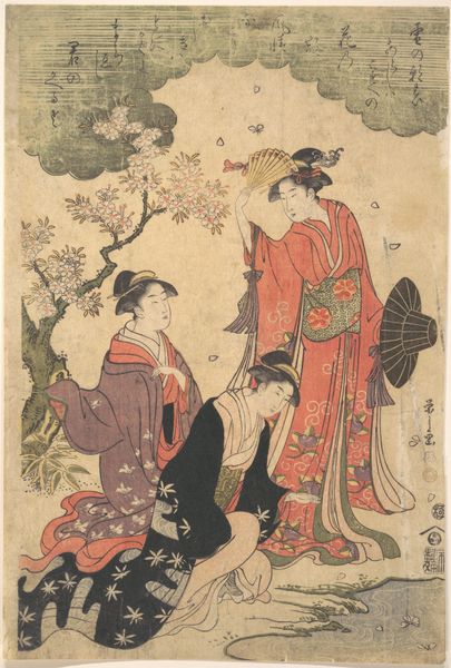"Scene at the Ishido Mansion," a woodblock print by Torii Kiyonaga, invites us into a world shaped by the intricate social dynamics of 18th-century Japan. Kiyonaga, working within the Ukiyo-e tradition, presents a snapshot of daily life, yet his work often transcends mere representation. The print depicts a moment of intimate drama: a samurai, seemingly unwell, is attended to by women in what appears to be the Ishido Mansion. Look closely at the women; their attention and concern suggest complex relationships, perhaps blurring the lines between duty, affection, and social obligation. While Kiyonaga’s style often celebrates female beauty and fashion, here, he subtly hints at the layered realities within these domestic spaces. The samurai's vulnerability, juxtaposed with the women's poised care, challenges traditional power dynamics, suggesting a narrative where emotions and relationships hold considerable sway. Through this delicate composition, Kiyonaga captures not just a scene, but a moment of shifting identities and unspoken stories.