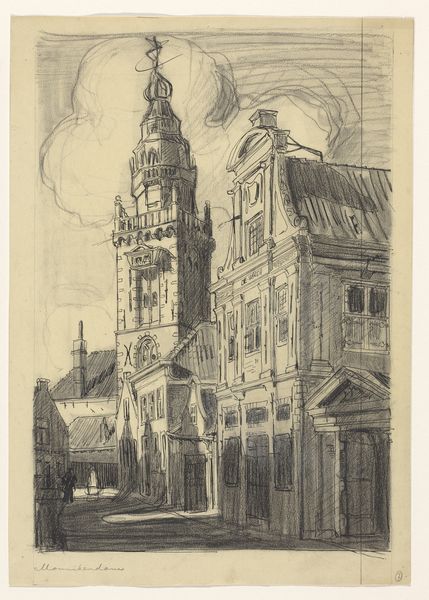 Editor: This is "Stadsgezicht," a cityscape etching by Wilhelmus Franciscus Marsman, created sometime between 1909 and 1924. The scene is quiet and almost dreamlike, the buildings are detailed, but what I noticed first are the strong telephone wires overhead, how would you interpret this work? Curator: Those wires are key, aren’t they? Juxtaposed with the traditional architecture and cobbled street, they signal the emergence of modernity, the tension between old and new. I see a society on the cusp of change. Where do these new technologies fit into traditional class structures and gender roles? This period saw burgeoning social movements… what do you think Marsman might be saying about the people within this changing urban landscape? Editor: It feels like a document of a very specific, transitional moment. Were etchings like this commonly used to represent social issues at the time? Curator: Absolutely. Printmaking was a more accessible medium than painting, allowing for wider dissemination of images and ideas. Think about the role of printmaking in political cartoons or disseminating information about social reforms. Marsman could be inviting us to consider how industrial advancement impacts daily life and the community. How does the looming church factor in? Editor: That's an interesting question. I hadn't considered it that way; perhaps it's about questioning faith amidst technological advancement? Curator: Or perhaps reflecting on enduring community values amidst social upheaval. These buildings aren't just stone; they are repositories of collective memory. Art provides space for questioning these things. Editor: I never thought about etchings having such a complex cultural meaning! It has definitely made me view this art in a completely new way. Curator: Indeed, art like this holds within it, histories that we may consider in new ways.