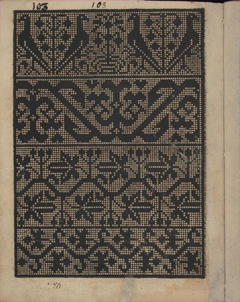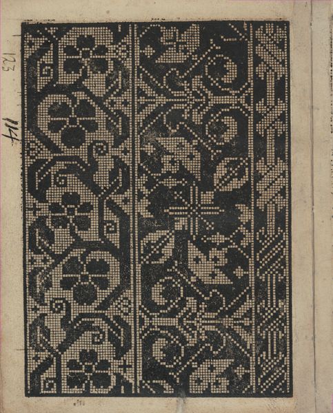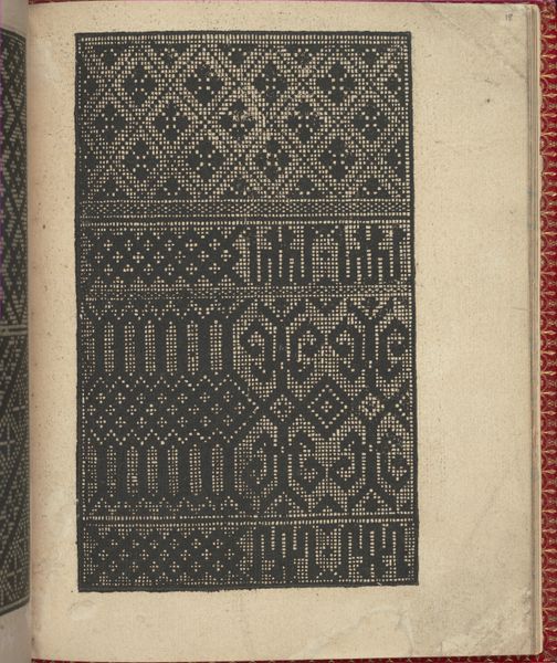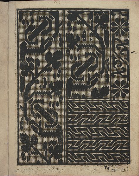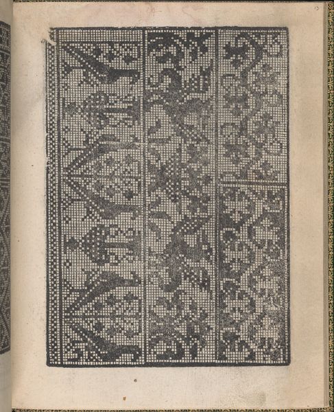 Editor: This is page 21 from Matteo Pagano’s "Ornamento delle belle & virtuose donne," created in 1554. It seems to be a print of some sort of decorative pattern. The image is primarily geometric and floral; it's very detailed and symmetrical. What strikes you about this piece? Curator: Immediately, I’m drawn to the interplay between positive and negative space. Observe how the dark, dense pattern is counterpointed by the precise grid that structures the entire composition. Editor: I see that grid. It almost looks like pixel art. Curator: Precisely. Consider, too, how Pagano manages to create varied textures within a limited tonal range. Note the subtle variations in line weight and the density of the cross-hatching. How do these techniques affect the overall reading of the image, in your view? Editor: It makes it seem less flat, maybe? Like there’s depth, even though it's just a pattern on a page. And the detail really invites you to look closer and appreciate the craftsmanship. Curator: Indeed. Even the slight imperfections in the printing process – the irregularities in the ink, the subtle shifts in alignment – contribute to its aesthetic quality. These aren't flaws but rather integral elements of its material presence. Editor: That's interesting, I wouldn't have thought about it that way. I was so focused on the design. Curator: The design wouldn't exist without the print and paper it's on. Examining the interplay of its material and structural properties offers a profound entry point for deeper understanding. Editor: I see what you mean. I definitely appreciate the amount of skill it would take to create this sort of symmetry by hand, and that it’s also a cultural artifact. Curator: And I can more deeply appreciate the importance of pattern-making as a fundamental feature of art across time.