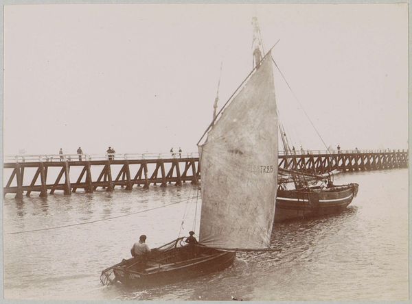 Curator: I'm immediately drawn to the subdued atmosphere in this image. The monochromatic palette feels so somber and nostalgic. Editor: Indeed. We're looking at a gelatin-silver print titled "Zeilschepen op de Maas," or "Sailing Ships on the Meuse," attributed to Folkert Idzes de Jong. Its creation is estimated to be sometime between 1905 and 1907. It really captures a sense of industry, doesn't it? Curator: Absolutely. The composition directs my gaze across the water, noticing the contrast between the smaller, possibly steam-powered vessels, and the sailing ships themselves. They are potent symbols of tradition being encroached upon by modernity. You see that progression of power represented on the water. Editor: Precisely. And how the city looms in the background, emitting smoke from factories, signifies a new reality for this port city. It really reminds us that ports are central to the exchange of goods and ideas and, also unfortunately, sources of pollution. Curator: Consider how de Jong presents this river too, almost mirroring the sky in tone, blurring boundaries. Perhaps a metaphor for the fluidity of change, the uncertainty that these port cities faced as they industrialized. Water itself holds layers of symbolism; the unconscious, journeys, and cleansing all come to mind. Editor: It is intriguing how a single photographic print manages to say so much about its time. This particular photograph speaks to me about the transition between sail and steam. Also, it touches on larger shifts in economy and labor happening during this period, the kind that reshaped cities along with individual livelihoods. Curator: Right, those shifting livelihoods, caught on film. Before a complete takeover. The quiet mood gives the work added weight. Editor: And the composition creates the context that adds such historical significance. It makes me consider the future implications that this transition posed on society, on the lives of workers specifically. I also think about our role in presenting works such as these. Curator: Exactly. Visual reminders and ongoing dialogues connecting the past to the present, and urging questions for the future. Thank you. Editor: It was my pleasure.