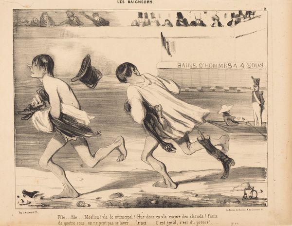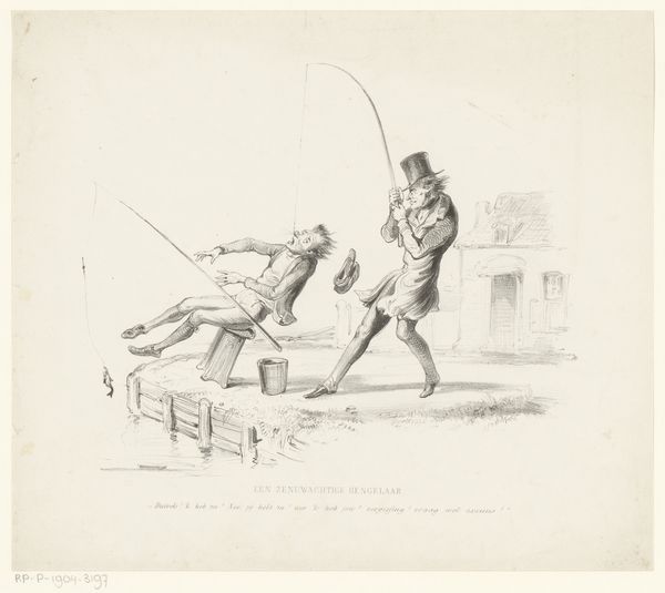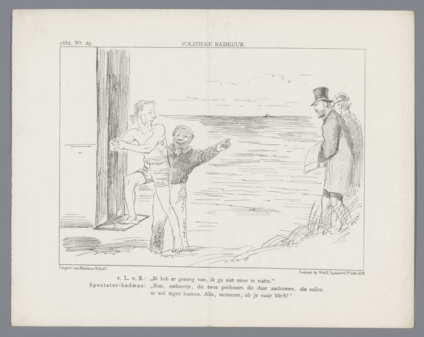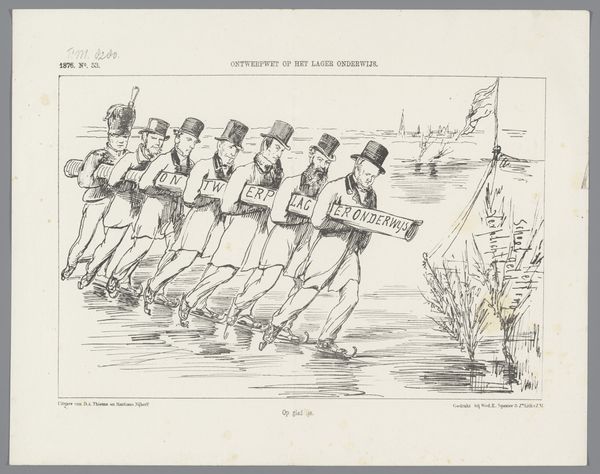 Johan Michaël Schmidt Crans created this print in 1875, capturing the Dutch railway debate. The composition is striking: figures, presumably representing different cities or factions, are spread across the plane, each standing on a labeled rectangle, oriented in different directions. Notice how the figures are arranged: a collection of poses with arms outstretched, as though trying to hold their ground, resisting pressure. The image destabilizes the idea of unity, instead emphasizing fragmentation and conflicting interests. This visual chaos speaks to a deeper tension: how to reconcile individual concerns within a larger collective project. The stark lines and flat perspective emphasize this sense of disconnect. It’s a deliberate choice, one that mirrors the fragmented nature of political discourse and the challenges of building consensus. The print serves as a reminder that meaning is not fixed but emerges from the interplay of diverse perspectives and competing claims.