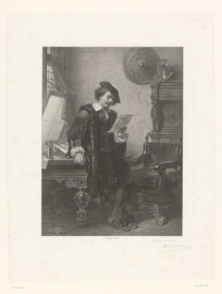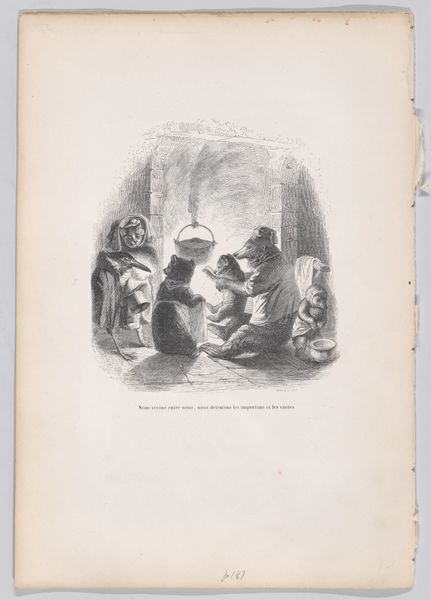 Editor: This is "Bedelende jongen met hond" – Begging Boy with Dog – an engraving by Hendrik Wilhelmus Last, created sometime between 1827 and 1863. It’s currently housed here at the Rijksmuseum. The subject matter is quite direct; a young boy with a dog, seemingly down on their luck. I am immediately drawn to the contrast in textures; from the rough coat of the dog to the boy’s worn clothes, what compositional elements stand out to you? Curator: The image's structure is rooted in its tonal contrasts. Consider how the artist has employed light and shadow to sculpt form. The soft, diffused light across the subject and dog create a stark relationship with the more obscured setting. The relationship establishes a thematic balance between vulnerability and resignation in an unforgiving world. Can you describe the boy's pose in terms of structural principles? Editor: He’s kneeling, offering his upturned hat. One hand gestures towards the viewer, maybe an invitation or plea? His body almost mirrors that of the dog; creating a shared experience in suffering. What about the formal structure heightens this reading? Curator: Precisely. The echoing forms and subdued palette—achieved through engraving—flatten the image; further underscoring the relationship between human and animal and its subtle gradation from light to dark. These techniques force our eye across the horizontal expanse of the scene, emphasizing their shared experience rather than isolating them. Note how this contrasts with, say, more romanticized portrayals of childhood prevalent during this period. Did anything in this image stand out to you? Editor: Yes! The texture within the image feels… raw. Is that connected with Last’s choices on material? Curator: Without question. Engraving lends itself to fine detail but also a certain austerity. The strategic hatching creates shadow without resorting to dramatic color. The artist's control is evident in the modulation of these lines to achieve form and depth. Considering these elements, what overarching themes do you observe in this print? Editor: So, looking closely at the lines, shadows, and even how the boy is positioned within this sort of gloomy landscape, you start to consider poverty, hardship, and resilience from Last’s work! This has certainly brought a different dimension to how I understand artistic choices. Curator: Agreed. Understanding the structure reveals so much more than simply a sentimental scene.