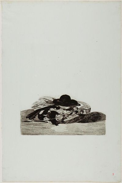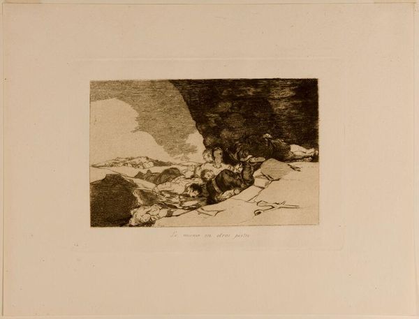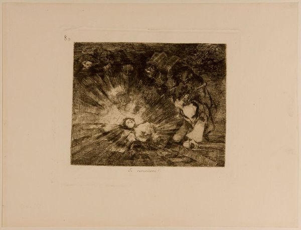Editor: This etching is titled "Cruel Tale of Woe!" by Francisco José de Goya y Lucientes, housed in the Harvard Art Museums. It’s somber, tragic even. What do you see in this piece that perhaps I'm missing? Curator: Oh, but you’ve already touched its heart, haven't you? The piece speaks of suffering, a lament. Goya, he wasn't one to shy away from the darkness, was he? Look at how he uses aquatint to create those deep shadows. I think it gives the scene a certain weight, a palpable sense of sorrow. What do *you* think? Editor: I agree. It’s not a pretty picture, but there’s something compelling about its rawness. Thank you for helping me see more in it. Curator: The pleasure was all mine. Art like this, it's meant to stir us, to make us feel, wouldn’t you agree?