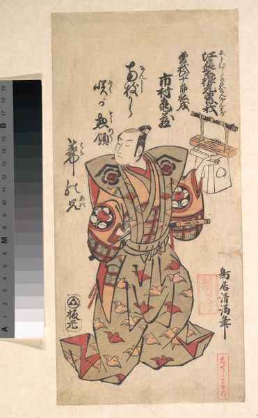 Curator: Okumura Masanobu created this striking woodcut print titled "The Mogusa-uri Scene from the Drama 'Chujo-hime Hibariyama,' Performed at Yamamura-za" sometime between 1710 and 1713. It depicts a scene from a play popular at the time. Editor: My first impression is one of theatrical energy, though it's all rendered in rather austere lines. The color feels absent, focusing attention on form and line work. Is this typical of early woodblock prints? Curator: Yes, early ukiyo-e prints like this were often monochrome, with color added later, initially by hand. Masanobu was actually a pioneer in developing color printing techniques, so it is interesting that he rendered this artwork without them. The print is depicting a popular drama performed at the Yamamura-za theater in Edo, showing how closely intertwined art and popular entertainment were during the Edo period. Prints like these acted almost like theatrical posters or souvenirs. Editor: Considering it's a woodcut, I am intrigued by the varying line weights, particularly the bolder lines defining the figures' robes, versus the finer, almost wispy strokes in the facial details. How did the printmaker achieve that level of detail in this process? Curator: Woodcut printing requires careful carving, of course. The artists needed skilled artisans to translate their designs onto woodblocks. Different tools and techniques allowed for achieving variations in line thickness and texture. The process, the very materiality of the wood, influenced the aesthetic. And indeed, these prints became quite affordable so, this accessibility democratized art to a certain degree during this period, something new! Editor: Democratization through mass production - yet the aesthetic feels rather refined, not “mass produced,” even in its bold simplicity. The layering of patterns, though presented without color, indicates texture in the fabrics. Curator: Yes, exactly. Prints such as these also played a crucial role in shaping perceptions and popularizing cultural trends across different social classes. They circulated imagery and ideas throughout society. The theatrical scene itself likely provided commentary on the current events and social customs. Editor: I see it now—the print functions not only as art but also as a socio-cultural mirror. Thanks, this woodcut says a lot more than I originally understood. Curator: Indeed. Analyzing the social contexts, artistic approaches and impact is critical in appreciating such art.