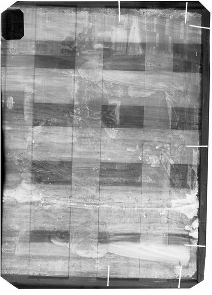 Editor: Here we have an x-radiograph of Hieronymus Bosch's "Arrival of the Magi" from the Harvard Art Museums. It’s fascinating to see beneath the surface. What do you see in this ghostly version of the painting? Curator: For me, it's like peering into the artist's mind, a hidden layer. The x-ray reveals the underdrawing and changes Bosch made, a kind of dialogue with his own creation. It's a beautiful metaphor for how we all evolve, isn't it? Editor: That’s so interesting, a dialogue with creation. I hadn't thought about it that way. Curator: Absolutely. It reminds us that art, like life, is a process of layering, revision, and ultimately, revelation.