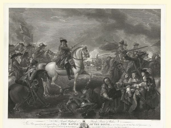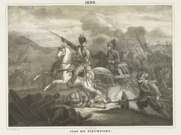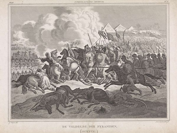 Curator: Good day, let’s delve into this piece entitled "Wellington tijdens de slag bij Waterloo, 1815," or Wellington at the Battle of Waterloo, 1815. This engraving and etching comes to us from Frederick Bromley, completed around 1837. What is your initial take on this piece? Editor: My breath just hitched—the dynamism, the grit. Even in monochrome, there’s a swirling energy here, a controlled chaos that speaks volumes. A heavy atmosphere that reeks of tension and, frankly, terror. Curator: The romanticism style is palpable, idealizing war yet hinting at its brutality. Consider the print's public function in Britain during this period; such art served to mythologize Wellington and reinforce national pride. It transformed the historical battle into cultural propaganda. Editor: Absolutely, though what really strikes me is how the chaos of battle is concentrated into this foreground drama. The expressions, even with the limits of etching, capture something about facing oblivion. I almost feel sorry for everyone involved—I find myself reaching out. Curator: Bromley indeed was meticulous in depicting military leaders, while the mass of soldiers appear indistinct. The politics are subtle yet very calculated in what details are emphasized versus downplayed. Editor: True, but maybe the indistinct mass represents the everyman lost in war’s grand narrative? I can imagine Bromley obsessing over the musculature of the horses; they embody raw power. Curator: Such powerful imagery often ignores underlying realities. The cost to common soldiers, the long-term social consequences, even the sheer environmental devastation, remains outside this scope of triumphant glory. The lack of location may also give clues on a larger scope of these kind of history-painting styles. Editor: And maybe that's the art’s dark genius? A celebration tinged with undeniable human cost? Art becomes this weird agreement between propaganda and lived memory. A memory that hurts so bad, we wish to celebrate a little triumph as a way to let it be. Curator: Well put. In considering the context surrounding Bromley's "Wellington tijdens de slag bij Waterloo, 1815", we see more than just skillful artistry but observe the cultural shaping power this type of work held. Editor: So as we step away, it sticks in my mind – this potent, poignant snapshot—the beauty, yes, but the undercurrent of sorrow too, an elegy hidden within celebration, and the many shades of grey surrounding such events.