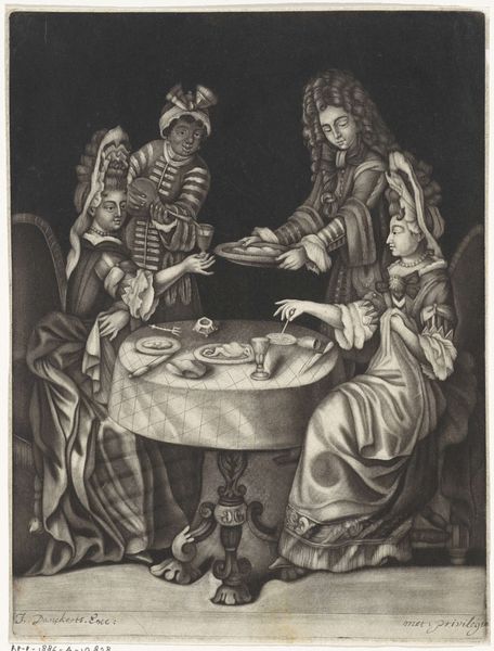 Curator: Before us hangs Martiros Sarian’s 1937 drawing, "Illustration to 'Armenian Folk Tales.'" The piece employs ink and pencil on paper, a traditional medium, to bring a narrative scene to life. Editor: My first impression is one of hushed intensity, like we've stumbled into a scene pregnant with anticipation. It’s dreamlike, but grounded by the mundane setting of a meal. Makes you wonder what tales this group is swapping, right? Curator: Precisely. The formal construction suggests an interest in portraying Armenian cultural identity, rendered in the genre painting tradition. Notice the strategic placement of the figures, particularly the gaze and posture that command visual attention, inviting the viewer into the depicted storytelling community. Editor: Those eyes are magnetic, aren't they? There's a playful tension in the piece as well. Everyone seems present but also somewhere else, perhaps lost in the vibrant threads of imagination. Even the details like the fruit centerpiece almost have a life of their own! Curator: One cannot overlook the visual architecture of the composition itself. The repetition of vertical structural forms and angular details serve not only to give an insight into the culture, but to emphasize an awareness of geometrical arrangements that operate as symbols of folk tales' deep narratives and internal complexity. Editor: Totally! And something about the grey scale creates an atmosphere almost… nostalgic? As if we're witnessing echoes from the past, brought to life through charcoal whispers and soft hues. I love how it blends realism with the whimsical. It creates space for the viewer to engage and imagine. Curator: Indeed, it bridges temporal spaces between tradition and the present viewer. It's a study of the way Sarian utilizes conventional formal language for cultural interpretation. Editor: What a fantastic way to engage with the spirit of storytelling. I am feeling strangely grounded after diving into those imagined worlds. Curator: Quite. It brings me to think that folk stories continue to offer new points of reflection, now and forever.