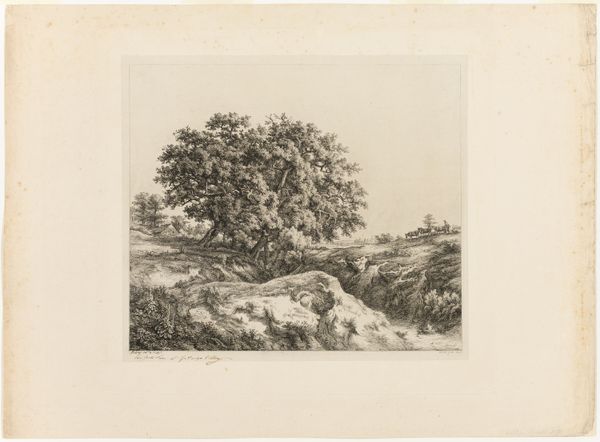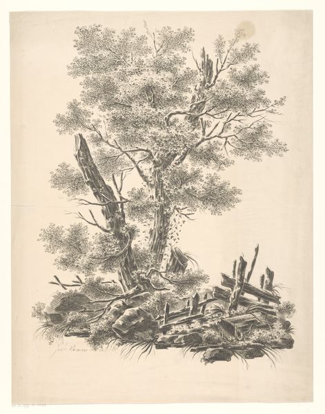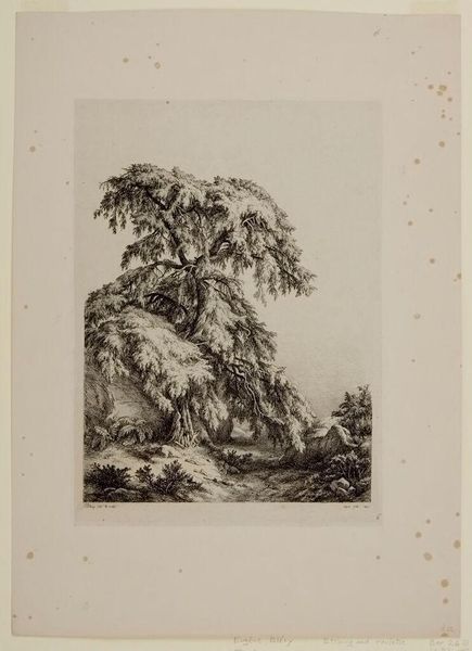 Curator: Eugène Bléry’s “The Juniper Tree, Fontainebleau,” etched in 1840, invites us to consider the romantic relationship between humanity and nature. Editor: My first impression is one of stillness and age. The density of detail almost makes the tree feel like it is pushing against the picture plane, weighted down by time. Curator: It is fascinating to consider Bléry's choice of subject. Juniper trees are often symbolic, tied to notions of purification and resilience in different cultural contexts. In a time of increasing industrialization, was Bléry subtly commenting on the need to preserve the sanctity of the natural world? Editor: That’s compelling. Visually, the juniper presents a paradox. While detailed and realistic, it almost looks like frozen lace. Juniper’s association with immortality connects to enduring forms, as opposed to industrial output with more fluid ties to cultural memory and symbolic understanding. Curator: Yes, there is also an element of melancholy, perhaps indicative of the Romantic movement’s fascination with the sublime and the inevitable encroachment of civilization. Bléry captures this tension using a method of detailed realism, the tree appearing almost like a defiant stand against progress. The interplay between light and shadow really captures the complexity of that feeling. Editor: Thinking about light, the etcher created contrast, with a stark visual tension. Darker tones pool underneath its branches, and create a sense of sanctuary that almost encourages retreat from brighter realities, that feels incredibly deliberate to invite particular reflection from viewers. Curator: Perhaps "sanctuary" is precisely what Bléry hoped to convey, a haven, which carries resonance for the human condition in general during moments of rapid change. Editor: It has given me plenty to contemplate; seeing this work makes one think about how art can capture the depth and density of our past as a reference point for understanding identity today. Curator: And it underlines the crucial, continuing need for vigilance against those forces seeking to diminish our connection to our shared planet.