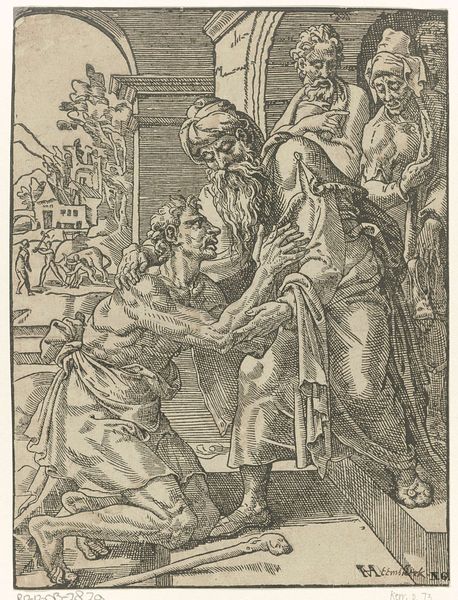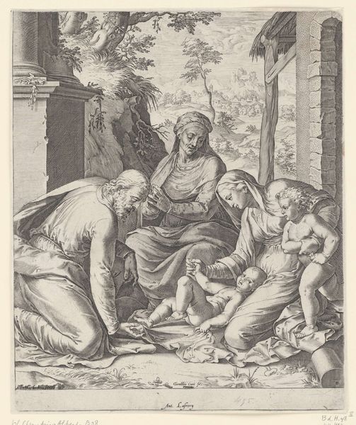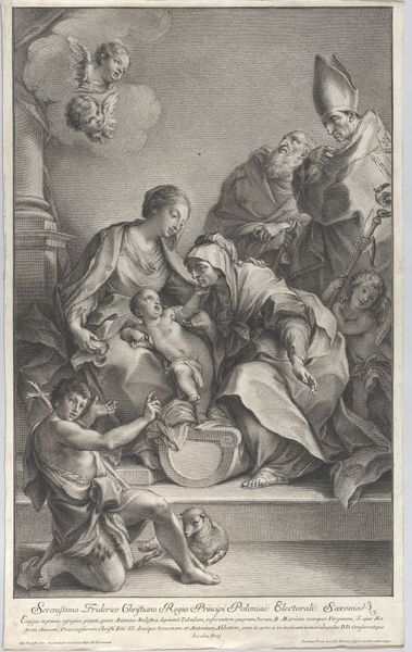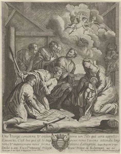 Editor: Here we have Bartolomeo Biscaino’s “The Circumcision of Christ,” an engraving dating from around 1640 to 1657. It’s incredibly detailed for a print, almost overwhelmingly so. What do you see in this piece, beyond the obvious biblical scene? Curator: It's a fascinating tableau, isn't it? But what I find truly compelling is the way Biscaino grapples with power dynamics here. Consider the historical context: in the 17th century, representations of religious events were often deployed to reinforce existing social hierarchies. Does this image challenge that, or reinforce it? Editor: I hadn’t thought of that. It does seem pretty traditional – Mary looks very passive, the men are the active participants… Curator: Exactly. And what about the children in the foreground? Are they innocent cherubs, or do they symbolize something more complex within the narrative? Remember, art doesn't exist in a vacuum. This image is a product of its time, reflecting and perhaps subtly critiquing the patriarchal structures of 17th-century society. How do the gazes of the figures influence your understanding? Editor: That’s a great point. The older men seem to hold all the power through their knowledge, their gaze directed downwards... whereas Mary averts hers. Is the circumcision shown as the introduction of a baby boy into a community governed by men? Curator: Precisely! And consider the composition itself - the way the artist positions the figures. What power dynamics are visible through these structural elements? Editor: The angles certainly lead you to view the event through their eyes and perspectives. I never thought of engravings having this much depth. Curator: Absolutely. Art like this becomes a lens through which we can examine the social and political landscape of the time. Considering its legacy, and perhaps our complicity, adds even more layers. Editor: Wow, I'll never look at Baroque art the same way again. There is so much here.