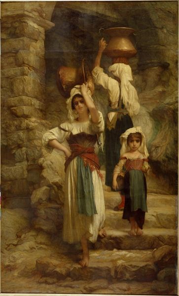 Editor: William Bouguereau's "Return from the Harvest," painted in 1878, showcases such lively activity. I am particularly struck by the light playing over the figures' faces; what does this composition evoke for you? Curator: It’s tempting to view this simply as a celebration of rural life, but considering its context, the painting offers a curated image of peasant life for the consumption of an urban, bourgeois audience. Notice how idealized the figures are: clean, attractive, seemingly untouched by hardship. How does this romanticism strike you in light of other contemporary portrayals of working-class individuals? Editor: Well, it feels like it sanitizes the experience, making it more palatable for the upper classes, doesn’t it? Like a carefully staged tableau rather than a raw slice of life. Curator: Precisely! Bouguereau’s skill allowed him to paint for the market, crafting an appealing narrative rooted in academic traditions. He offered a vision of the peasantry that confirmed prevailing social hierarchies while seemingly honoring rural labor. What effect does this have on our perception of the image now? Editor: It makes me question whose story is really being told. The painting almost seems to be saying more about the values of the art market than the lives of the peasants themselves. It also creates expectations about how the life of common folk has to be, far from reality. Curator: Yes, considering this painting in its historical context unveils a fascinating intersection of artistic skill, social power, and market demand. Examining what's present versus what’s omitted helps to read an image like this beyond the simple prettiness it so expertly projects. Editor: I agree, I didn't expect such commentary behind an outwardly pleasant scene. Now, I realize the art market influences every piece that enters it.