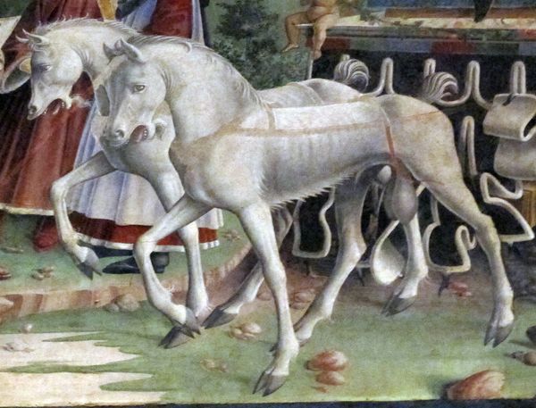 Benozzo Gozzoli painted this fresco of Giuliano de Medici as part of a larger series in the late 15th century, using traditional pigments applied to wet plaster. The vibrant colors and meticulous details were achieved through a combination of natural mineral pigments, ground and mixed with water, and applied with brushes of varying sizes. The fresco technique itself is a testament to both skill and labor, requiring careful preparation of the plaster surface and a rapid execution of the painting before the plaster dries. Each color has been added individually, building up layer by layer to create a rich tapestry of textures and tones. The materiality of the fresco, with its earthy pigments and tactile surface, serves as a reminder of the physical labor involved in its creation, as well as the cultural significance of the work. By emphasizing the value of craft and skill, Gozzoli elevates the status of the artwork beyond mere decoration, imbuing it with social and cultural meaning.
