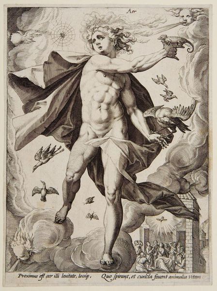 Editor: This is Hendrick Goltzius’s “Lucht,” from 1586, a print currently held in the Rijksmuseum. It's striking how the figure dominates the composition; it's a very muscular nude male surrounded by birds and other creatures in the air. How do you interpret this work? Curator: This engraving invites us to consider the intersections of power, representation, and the natural world within the historical context of 16th-century Europe. The allegorical figure embodies "Air," one of the four elements. Given the historical backdrop of colonialism and scientific exploration, how does Goltzius's representation of air and its creatures reflect the era’s evolving understanding, and exploitation, of the natural world? Editor: I see what you mean. It’s not just a simple representation; it speaks to the human impulse to categorize and control nature. Curator: Precisely. And consider the male nude. How might this idealised form also reinforce societal power structures related to gender and class during that time? The control implied over nature here could parallel social domination. Editor: That's a connection I hadn’t immediately made. The figure's pose feels almost triumphant. Curator: Triumphant, yes, but perhaps also burdened by the responsibility—or even the hubris—of dominion. Note the contrasting vulnerable creatures that inhabit 'his' element. The inscription itself suggests this nurturing aspect, but does the visual representation fully support that reading, especially considering what was happening with resource extraction during this time? Editor: I’m starting to see it as a commentary on the relationship between humans and the environment, even if unintentional. Thanks for providing me with a fresh perspective that incorporates more in-depth analysis. Curator: And thank you for allowing me to reflect with you! This piece can serve as a visual prompt that facilitates conversations around environmentalism and social equity.