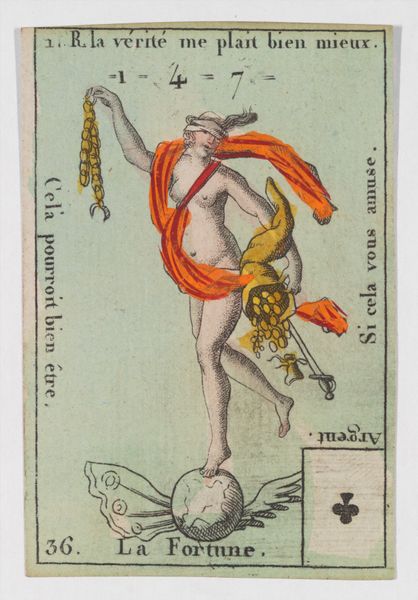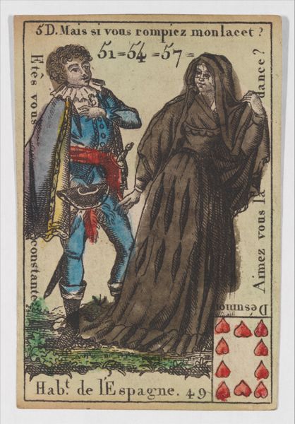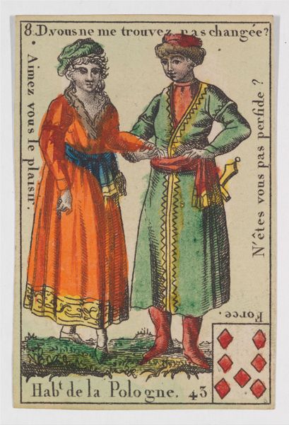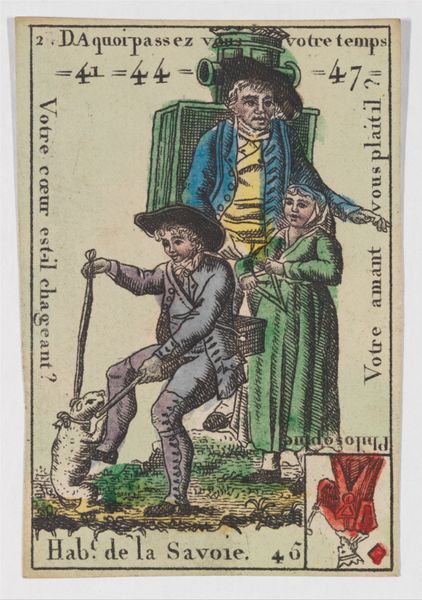 This playing card, "Hab.t de l'Angleterre," was printed in France and depicts a quartet of "Costumes des Peuples Étrangers," or costumes of foreign peoples. The image presents an idealised vision of English fashion. We see a woman in a flowing gown and bonnet, her hand tenderly held by a gentleman in a blue coat, yellow breeches, and riding boots. These costumes, though meticulously rendered, also project a certain French sensibility, perhaps hinting at a sense of cultural superiority. The card is emblazoned with text in French, which translates as: 'It is good taste’. Cards such as these circulated within a culture of leisure and education. As a historian, I'm drawn to the visual codes, cultural references, and historical associations that make up this image. To understand it better, we could explore fashion plates and conduct archival research into French perceptions of English society, including the complex social, economic, and political relations between England and France. Through this research, we begin to appreciate how even a seemingly simple playing card can be deeply embedded in its social and institutional context.