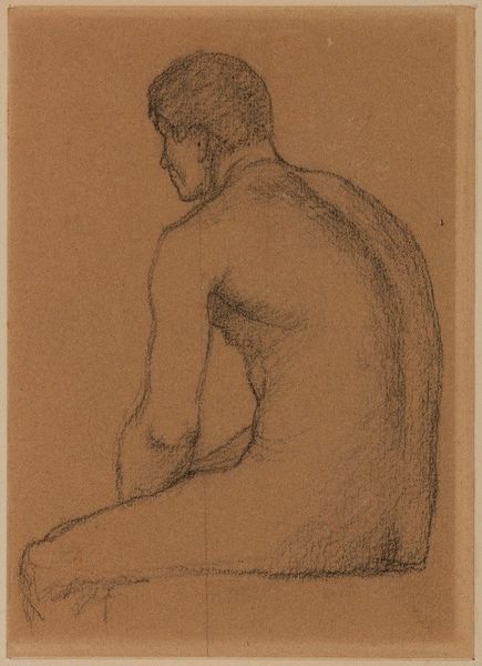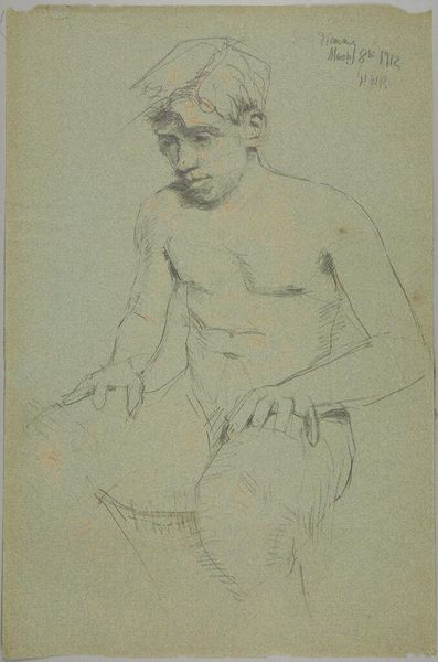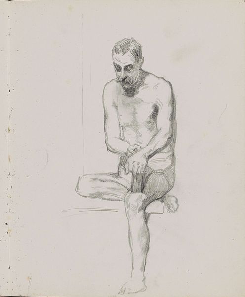 Editor: Here we have Eugène Jansson’s 1906 pencil drawing, "Carl Gyllins". It's striking how the artist captures a sense of quiet contemplation in the sitter. How do you interpret the symbolism, or lack thereof, in such a direct and seemingly unadorned image? Curator: While seemingly straightforward, even this simple portrait holds cultural echoes. Nude studies, especially of the male form, often alluded to classical ideals of beauty and strength. Does this portrayal of Gyllins remind you of specific historical figures or heroes? Is there a certain aesthetic quality here that you find repeated in other historical examples? Editor: Not immediately, although the pose… maybe something Greek? Curator: Perhaps, or it might speak more directly to turn-of-the-century artistic explorations. The "New Man," the exploration of masculinity prevalent at the time is present here. Look closely at his gaze: confident yet also… vulnerable? Consider the societal shifts happening then; this might represent an evolving idea of masculinity. How does the relative bareness contribute, versus costuming him formally? Editor: It does feel vulnerable. Less a triumphant hero, more…real. Leaving him nude certainly feels like removing artifice. I never considered that element, thanks. Curator: And what does removing the artifice communicate in 1906 Sweden? How is that received by audiences or Gyllins himself? How do the choices we see here impact a legacy? Art often contains encoded conversations about identity. Every line tells a tale, doesn't it? Editor: Absolutely, and you’ve illuminated a great depth to this drawing, considering the man, the artist, and his era. Curator: It's in recognizing the interconnectedness of symbol, subject, and societal context that these sketches truly resonate.