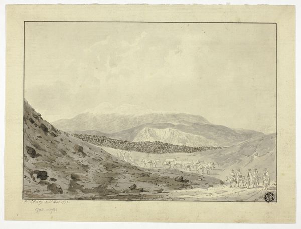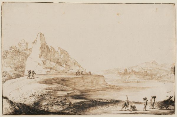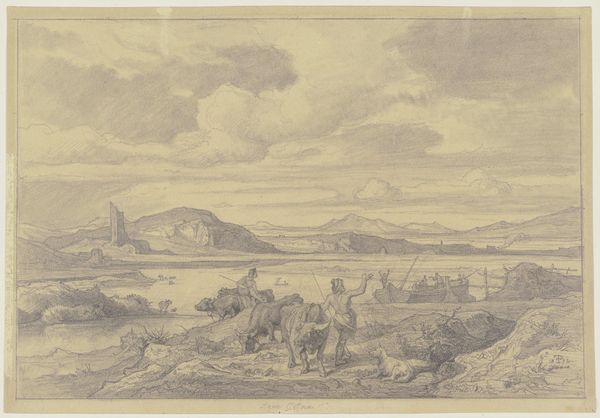 Friedrich Preller the Elder created this Italian landscape with graphite on paper. At first glance, the composition, dominated by horizontal lines and muted tones, evokes a sense of stillness and classical calm. Preller’s use of line is particularly striking. Notice how the delicate, precise strokes delineate the forms of the figures, cattle, and the distant mountains, creating a layered effect that draws the eye into the landscape. The structure here is one of carefully balanced contrasts: the detailed foreground against the hazy background, the organic shapes of the animals against the geometric lines of the boat and ruins. This interplay between precision and ambiguity invites a semiotic reading of the artwork. The landscape elements—the river, mountains, and ancient ruins—can be seen as signs representing the passage of time, the relationship between humanity and nature, and perhaps, the enduring presence of the past. The image doesn't offer a singular, fixed meaning. Instead, it serves as an open field for interpretation. Consider how Preller masterfully uses the formal elements of line and composition to engage us in a visual and intellectual dialogue.