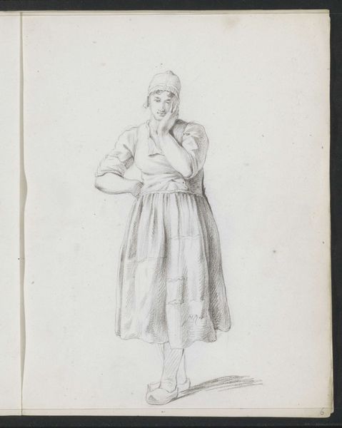 Curator: Here we have a drawing by William Hamilton, an 18th-century British artist. It depicts a seated female figure. Editor: I’m immediately struck by its simplicity and the earthy tones of the wash. It has a certain unfinished quality, revealing its process. Curator: Hamilton was known for his history paintings and illustrations. This drawing likely represents a classical figure, perhaps a muse or goddess. Note the staff and her draped clothing. Editor: The way the light falls, emphasizing the folds of the fabric and the musculature, speaks to Hamilton's understanding of form and his ability to convey texture with minimal means. It really highlights the material essence of the cloth. Curator: Precisely. The drawing embodies the neoclassical interest in idealized beauty and references the visual language of antiquity that permeated the period’s artistic and intellectual circles. Editor: It feels both timeless and tied to the artistic practices of its era, revealing the inherent labor of the artist in its careful execution. It makes you wonder about the availability of paper at the time, too. Curator: A fascinating dialogue it prompts, indeed. Editor: Agreed. It's a glimpse into the artist's mind and the social conditions of its making.