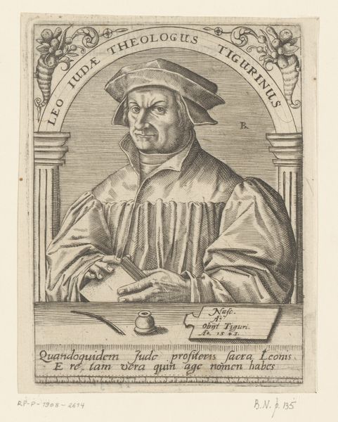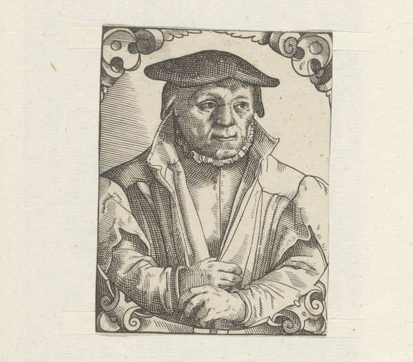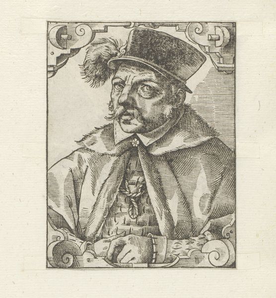 Lucas van Leyden created this engraving, Emperor Maximillian I, using black ink on paper. The meticulous, controlled lines define the form and capture a sense of authority and detailed precision. Notice how van Leyden constructs this portrait through a formal arrangement of architectural elements like the archway behind Maximillian, and the decorative panel in front of him. These frame the Emperor, but also serve to structure the visual space, creating layers that move the eye from foreground to background. The sharp, detailed lines in the engraving allow for a play of light and shadow, accentuating the texture of Maximillian's garments, hat and facial features. The use of linear patterns creates depth, but also emphasizes the symbolic weight of his status, contrasting the softness of the fabric with the hard lines of the surrounding architecture. The rigorous order of the etching reveals an underlying interest in structure and visual language. In essence, it captures not just the image of a ruler, but also the cultural and intellectual currents of its time.