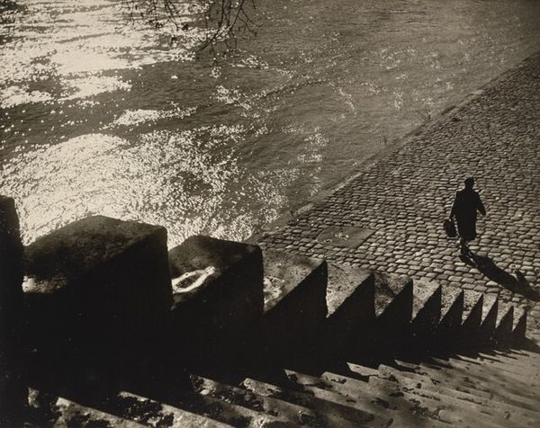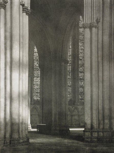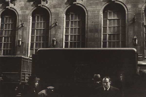 Paul Strand made "New York" using gelatin silver. It's a photograph, so the marks are made with light, and the darks are absolute. Strand worked with strong verticals and horizontals - the verticals create the dark rectangles of windows or doors or whatever they are, and the horizontal is the line of the sidewalk where people are walking. The surface texture of the photograph is quite smooth, but you can see a lot of different greys, and that creates a sense of depth and atmosphere. The light is raking, almost cinematic, and it emphasizes the anonymity of the figures walking along the sidewalk. There is a strong sense of form and space, and the contrast between light and dark is really striking. If you consider some of the German photographers from around the same time, like August Sander, you can see Strand grappling with the same issues of modern life. Ultimately the picture is a question mark. Is it about urban alienation? The geometry of the city? Or the way that light can transform the everyday world into something mysterious and beautiful?