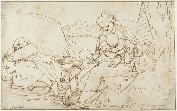 Editor: This is Luca Cambiaso's "Holy Family with Infant Saint John," made around 1562, using ink on paper. There's an almost dreamlike quality to it, like a memory half-formed. How do you interpret this work? Curator: It's interesting you say "dreamlike". Cambiaso, working in the Mannerist style, was playing with artistic conventions. Consider how the 'Holy Family' was usually portrayed - idealized, almost regal. Cambiaso’s image subverts that expectation, presenting them in what appears to be an intimate moment. The rough ink strokes feel immediate, less polished. It’s a deliberate shift in the public presentation of religious figures, humanizing them. What do you think that choice accomplishes? Editor: I guess it makes them more relatable, less distant. But does that choice have a larger significance? Was Cambiaso trying to say something about the Church? Curator: Potentially. This was a period of religious upheaval; the Reformation was in full swing. Art became a battleground for ideas. Showing the Holy Family in a more humble light could be seen as a challenge to the Church’s hierarchical authority, bringing religious figures closer to the everyday experience of the faithful. The institutional control over imagery was being renegotiated, and Cambiaso's art participated in that. Editor: So, the informality wasn't just an artistic choice; it was also a social statement. Curator: Precisely. Art is rarely created in a vacuum. The institutions commissioning, displaying, and interpreting the work influence its meaning. In this case, even Cambiaso’s style can be interpreted as a form of visual rhetoric that questions established norms. Editor: That's really interesting. I always looked at art through a purely aesthetic lens, but it's fascinating to see how deeply intertwined it is with social and political currents. Curator: Understanding the historical context allows us to decode the multiple layers of meaning embedded in the work. Art isn't just about beauty, it’s about power, belief, and the ongoing negotiation of values within society.