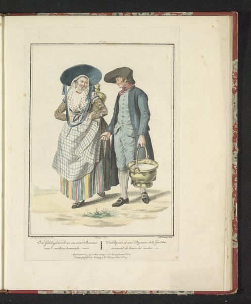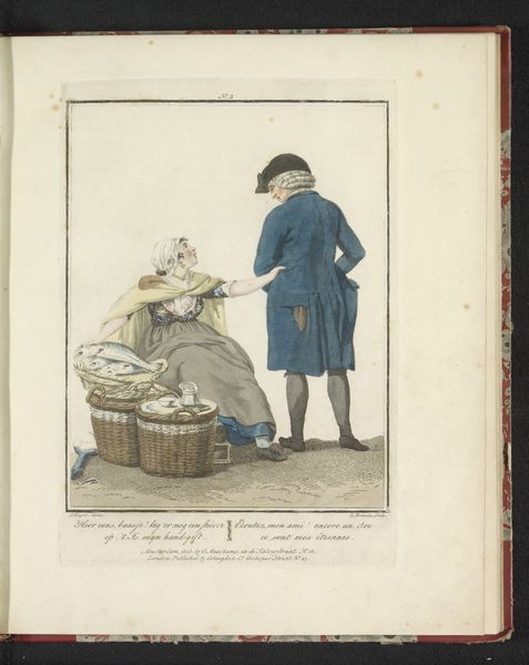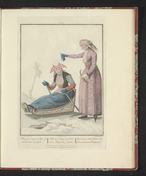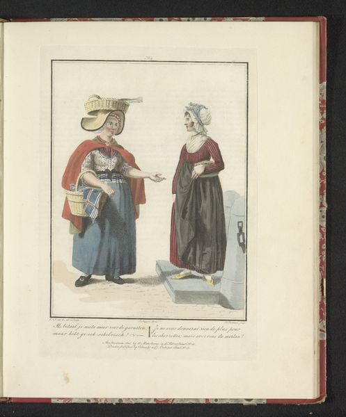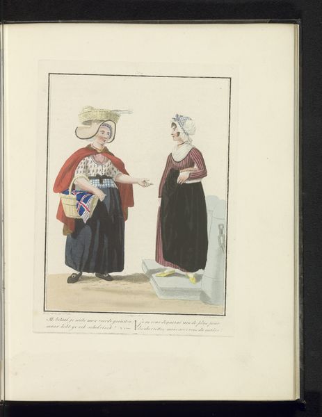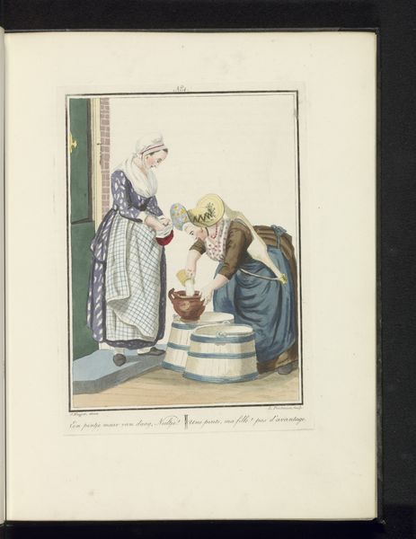 Curator: Let's take a look at this intriguing watercolor from 1803 entitled, "Dienstmeisje en melkverkoopster", or "Maidservant and Milkmaid" by Ludwig Gottlieb Portman. It’s currently held at the Rijksmuseum. Editor: My first impression is one of quiet industry. It’s a remarkably detailed depiction of daily life, with delicate shading and precise lines. There's something serene about the ordinary tasks these women are performing. Curator: It’s interesting you say that, because at first glance, genre paintings like this one appear simply to capture everyday life. However, within this representation, we also see the economic structures that defined women’s roles in society during that era. These depictions reinforced particular societal norms. Editor: Absolutely. We see two women— presumably a milkmaid pouring her product while the other receives it. There's a clear class division suggested here, reflecting the hierarchies prevalent in Dutch society. The details in their attire, and their differing positions in relation to the activity, tells us about the labour and societal position that these women held. It also invites questions around their status and if their labor was valued appropriately, as milk was an everyday resource. Curator: Right. Romanticism was emerging as a movement in Europe during this time. And while this genre scene is small and modest, we might observe subtle hints of Romanticism, specifically in the artist’s sympathetic treatment of labor. Editor: Yes, but this “sympathetic” view might also romanticize the hardships faced by working-class women. While capturing their lives is important, it's also key to remember they are performing essential labour but the image is only available to the middle class and above. What kind of visibility are they getting in society versus the romanticization on paper? Curator: Precisely the nuance to consider. This detailed genre painting functions as both social document and an artwork rooted in particular ideological values. Editor: Indeed. This small watercolor offers a powerful snapshot of a specific time and asks us to look a bit further into the story to examine the social and gender dynamics.