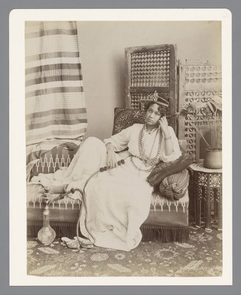 This mounted photograph, titled “Zwarte man met muziekinstrument” by Famin et Cie., presents a seated man holding a musical instrument. The sepia tones and the soft light give the image a textural richness, evoking a sense of historical distance. Structurally, the photograph is divided into a series of formal oppositions. The man's figure is sharply defined against the plain background. The linearity of his garment contrasts with the smoothness of the wall behind him. The instrument introduces a set of complex lines and shapes that disrupt the relative simplicity of the scene. In line with poststructuralist thought, one can say that the photograph's meaning isn't fixed. The subject's gaze and posture invite questions about representation, identity, and the gaze itself. The photograph exists within a network of cultural signs, inviting ongoing interpretation.