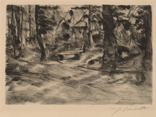Lovis Corinth made this etching, Birch Trees in the Tiergarten, sometime in his life. Look at the frantic energy of all those lines, like he was trying to capture the essence of the forest in one go. It's all about the process of looking, isn't it? The stark black and white creates an almost chaotic feel, but there's a method to the madness. Notice how the lines thicken and cluster to create depth, especially in the foreground. It's like Corinth is digging into the plate with his needle, trying to carve out the very soul of the trees. See that one dark patch, almost like a shadow lurking beneath the branches? It's unsettling, but also totally mesmerizing. For me, this piece feels like a nod to the German Expressionists, who were all about raw emotion. It makes me think of Käthe Kollwitz and her stark, powerful prints. Art's just one big conversation, right?