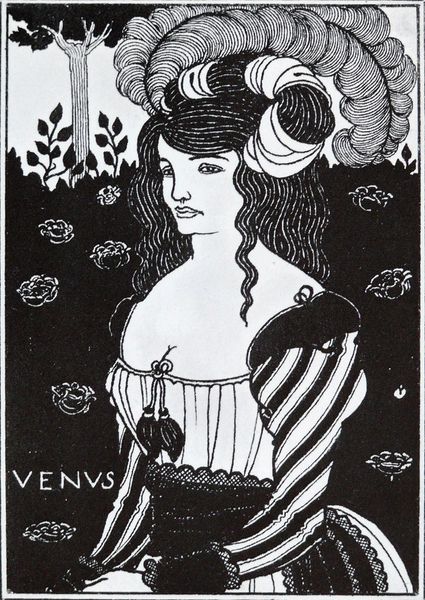 Editor: Here we have Koloman Moser's "Girl's Head. Cover design Ver Sacrum, 204", from 1899, a poster for the Vienna Secession's magazine. It feels incredibly stylized and the contrast is striking. What catches your eye about this piece? Curator: Immediately, the planar construction arrests the gaze. Observe how the artist uses the positive and negative space to delineate form; the face itself emerges from the interplay of light and dark, rendered almost immaterial. What structural relationships do you see in play here? Editor: I see how the curves of her hair and the surrounding roses echo the shape of her face, almost like a frame. And the text is integrated directly into the image; it feels like part of the design. Curator: Precisely. Note how Moser manipulates the pictorial field, organizing elements—the organic, the textual—within a unified surface. The two-dimensionality is emphasized, denying traditional perspectival depth. Do you perceive any tensions arising from this compositional choice? Editor: Maybe a slight flattening of the subject? It almost feels a bit…stilted because there isn’t any depth? Curator: A fair assessment. One could argue, however, that this flattening contributes to the poster's graphic impact. By minimizing depth and maximizing the interplay of contrasting tones and stylized forms, the artist compels us to confront the surface itself, celebrating the material reality of the artwork. Editor: That’s a good point. So it's less about realism and more about the artistic statement. Curator: Precisely! It directs us to consider its pure aesthetic construction and artistic function, as you noted by calling out the integrated use of typography within the illustrative elements. Editor: I see the design in a completely new light now. It is not about pictorial representation but more about form, space, and the message as a single object! Thanks for sharing this.