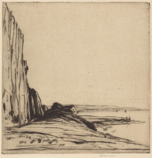Editor: This is David Young Cameron's "Appin Rocks," created in 1913, and appears to be a drawing or print. I'm really struck by the stark lines, almost like fractured planes, and how they capture this rugged, almost desolate landscape. What are your thoughts when you look at this piece? Curator: For me, this print embodies the relationship between artistic creation and industrial production. Consider the copperplate etching process: acid, metal, intense labor, and a press imposing force to transfer image to paper. Each line represents not just the landscape, but a confluence of material forces, and the artist’s manipulation of the manufacturing process. Editor: I see what you mean. It's not just a picture, but evidence of a physical process. How does that relate to the image itself, though? Curator: The choice of a barren landscape invites us to think about resource extraction. Are the rocks picturesque scenery or material for exploitation? The print medium democratized art for wider consumption, but simultaneously implicated it in market economies. Cameron, through his meticulous etching, grapples with high art's uneasy embrace of mass production. Editor: So, the medium isn't just the message, but also the *means* of production, highlighting the value we place on art in society? Curator: Exactly. Think of the paper it is printed on. Its raw material might have traveled long distances and undergone laborious procedures. A drawing can only exist through a confluence of circumstances of social, economic, and technical factors. The very act of creation is intertwined with networks of labour. Editor: That's fascinating, and I would not have approached it this way, now the image reveals so much about material, industry and context. Thank you! Curator: My pleasure. Looking closely reveals how much art is connected to everyday practices.