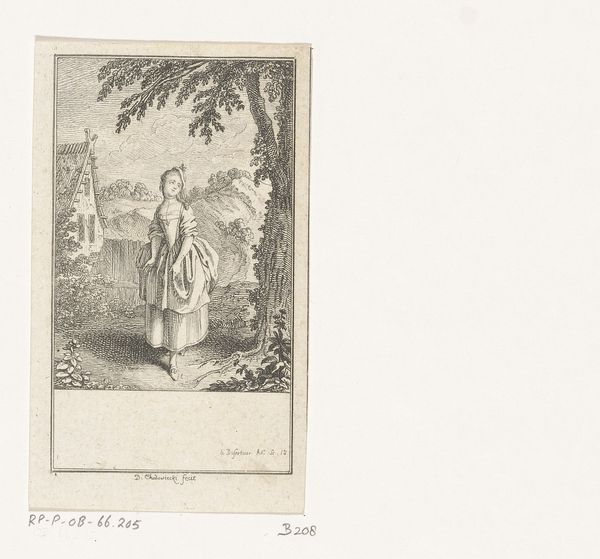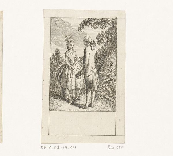 Daniel Nikolaus Chodowiecki created this print, titled 'Scène uit de Deserteur,' sometime in the 18th century, using etching techniques. This scene offers a glimpse into the complex social fabric of 18th-century life, where personal desires often clashed with societal expectations. The encounter between the woman and the apparent deserter raises poignant questions about duty, freedom, and the sacrifices individuals make in the face of oppressive systems. Chodowiecki, living in a time of significant social and political upheaval, presents a narrative ripe with themes of love, loss, and resistance. The print evokes a sense of emotional tension, inviting us to reflect on the human cost of conflict and the courage it takes to defy authority. The subtle interactions and unspoken words between the figures highlight the intimate struggles within broader historical contexts. Ultimately, 'Scène uit de Deserteur' reflects on the universal themes of human connection and moral decision-making, urging us to consider the personal stories behind historical events.