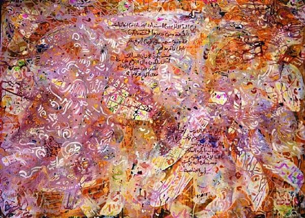 Editor: Alexander Roitburd’s “Annunciation,” created in 2008 using acrylic paint, presents a captivating swirl of vibrant color. The chaos feels… deliberate, almost like an emotional landscape. It's a lot to take in. What catches your eye, what story does this painting whisper to you? Curator: Well, my dear editor, it screams more than whispers! It’s a glorious mess, isn't it? Roitburd was all about emotion – a Ukrainian neo-expressionist, with the soul of a street artist and the mind of a philosopher. This "Annunciation" isn't your grandma’s Nativity scene. Look at the frenzy of lines, the near-violent application of pinks and purples... It feels almost like a spiritual experience, viewed through a kaleidoscope, a very *agitated* kaleidoscope. Do you see how the abstract shapes almost suggest figures, a hint of narrative buried within the energetic brushstrokes? Editor: I can see vague suggestions of figures. But is it really about the religious Annunciation then? Or is Roitburd using the title more… ironically? Curator: Exactly! Perhaps it's the annunciation of something else entirely— a new era, a personal revelation, or even just the sheer exhilaration of painting itself! Remember, abstraction can be the most potent form of storytelling. It gets under your skin, bypasses the logical brain, and hits you right in the gut. It is almost like the gospel, for a chaotic and uncertain world, wouldn't you say? Editor: That makes so much sense. It's definitely not a painting you just glance at and walk away from. I definitely didn't get all that on the first look. Thanks for blowing my mind a little. Curator: The pleasure's all mine, it seems, my young apprentice. Remember, art isn't always about answers. Sometimes, it’s about the beautiful, messy, exhilarating questions it provokes!