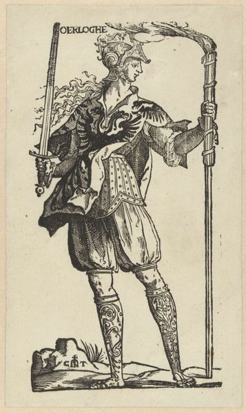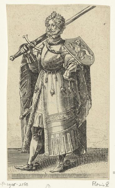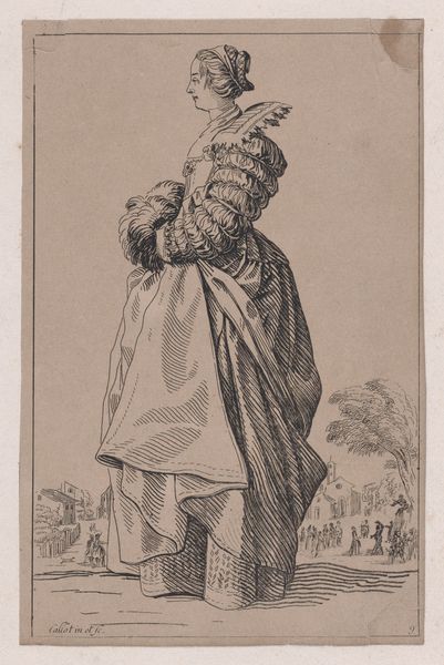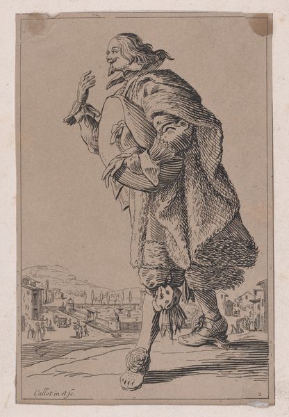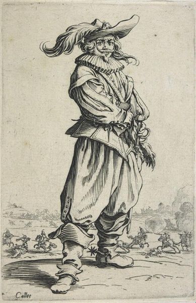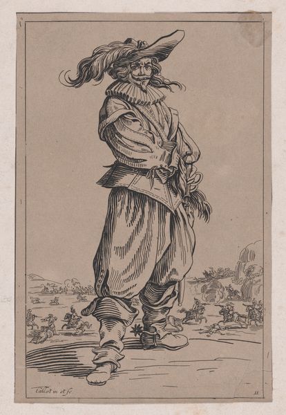 Editor: So this engraving is called "Copy of Le Gentilhomme au Plastron de Fourrure (The Gentleman with a Shirt Front of Fur), from La Noblesse (The Nobility)," made sometime between 1625 and 1700 by an anonymous artist. The detail is incredible; look at all those tiny lines! There's almost a miniature battle scene in the background. What do you see in this print? Curator: Formally, the success of this engraving resides in the striking contrast between the imposing figure of the gentleman and the chaotic scene unfolding in the background. Consider how the artist manipulates line weight to define form and space. Notice the intricate cross-hatching that builds volume in the gentleman's fur-lined garment. Editor: That cross-hatching really does give the fur depth. Curator: Indeed. And what of the composition itself? Observe the gentleman's placement—dominating the foreground, yet slightly off-center. How does this imbalance affect your reading of the work? Editor: I hadn’t thought of it that way, but it makes him seem less stable, maybe more human, even with all the fur and finery. I guess he’s not just a symbol of nobility. The action in the background kind of undermines his importance, now that I look closer. Curator: Precisely. The artist’s arrangement of forms guides us toward a more nuanced understanding. It questions, perhaps even critiques, the very notion of nobility it purports to represent. So, what is your reflection on the print? Editor: It's more than just a portrait; it is social commentary rendered through masterful technique. Thanks for showing me a fresh point of view! Curator: My pleasure. Engaging with art’s formal elements reveals its layered complexity.