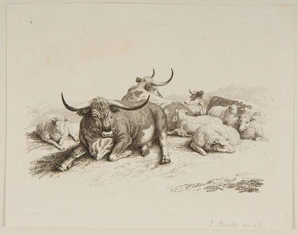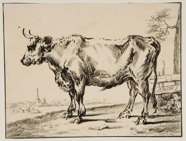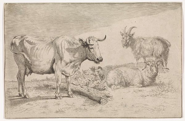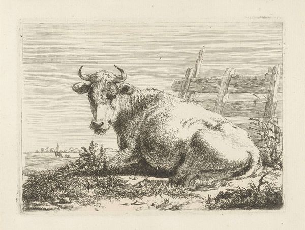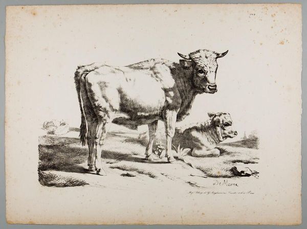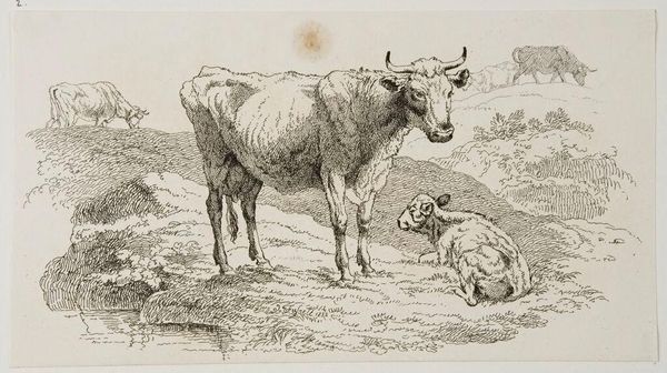 Editor: Here we have Johann Christian Reinhart's "Ox and Calf," rendered in delicate lines. It feels like a serene snapshot of pastoral life. What do you see in this piece? Curator: It whispers of a world viewed through rose-tinted spectacles, doesn't it? The idealized landscape, the placid animals... It's Reinhart yearning for a simpler time, a visual poem about nature's tranquility. Editor: The detail in the ox's fur is amazing! Curator: Indeed! He elevates the mundane, hinting at a deeper connection to the land. It reminds me of my grandfather's farm, where even the cows seemed to possess a quiet wisdom. Editor: I never thought about landscapes communicating a feeling of nostalgia before. Curator: It's a gentle reminder that art often reflects our longing for something lost, or perhaps, something we hope to find.