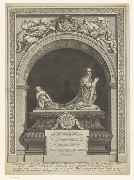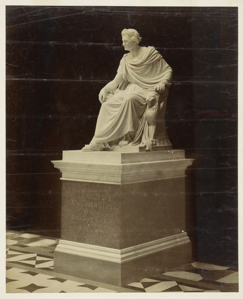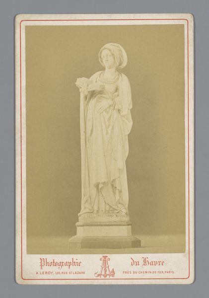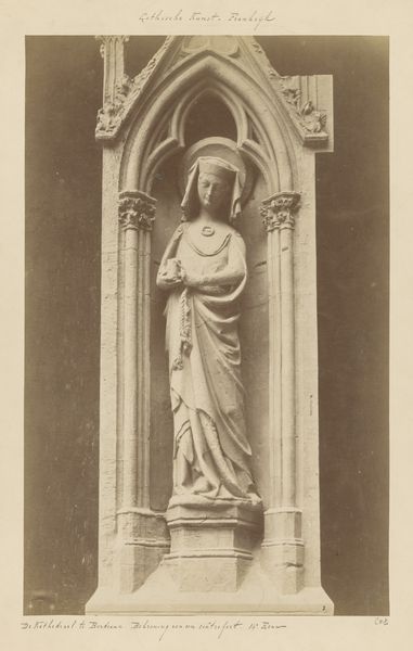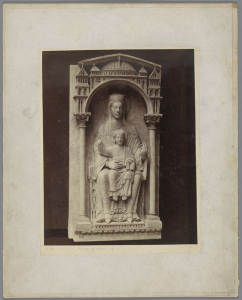 Curator: This is a gelatin silver print by Giacomo Brogi, dating from around 1860 to 1881. The image depicts a sculpture of Nicola Pisano in the Camposanto in Pisa, Italy. Editor: The sepia tones give it a certain gravitas, don't they? It evokes a real sense of age, of historical weight. Curator: Precisely. Notice how Brogi has positioned the camera. The sculpture dominates the composition. Its form, its inherent qualities, take center stage. We're invited to analyze the play of light and shadow across its surface, appreciate its formal arrangement within the frame. Editor: But the context is vital! The Camposanto itself, the other sculptural elements in the background… they're not just there for pictorial effect. They point to a complex network of artistic labor. Consider the stonecutters, the workshops that would have produced this sculpture, and others around it. Curator: Granted, yet the composition isolates the statue. The subject itself is further emphasized by the angle, which adds volume and weight. Semiotically speaking, the image communicates an assertion about cultural legacy and permanence. Editor: I am drawn to how photography allowed wider distribution and access. The labor invested not just in its creation, but also in its subsequent presentation— the print medium allowing a simulacrum to be owned and displayed at distance. I also can’t help thinking of this image’s status as an art reproduction. Who gets to record history, and who then consumes those depictions, becomes incredibly charged. Curator: You bring up compelling socioeconomic points. For me, however, I'm most interested in its representation of idealized form within defined aesthetic systems and modes. The sculpture becomes not just a physical object but a symbol to contemplate and emulate. Editor: Absolutely! And understanding both is essential. Knowing who made this photograph, for whom, where, how it was circulated: that brings texture and reality to those symbolic systems you observe. We might both be enriched. Curator: Indeed. I appreciate having taken this moment to consider this object from different but ultimately not oppositional views. Editor: To appreciate both the art, and the processes which allowed it to endure to be available to us now, to talk about.