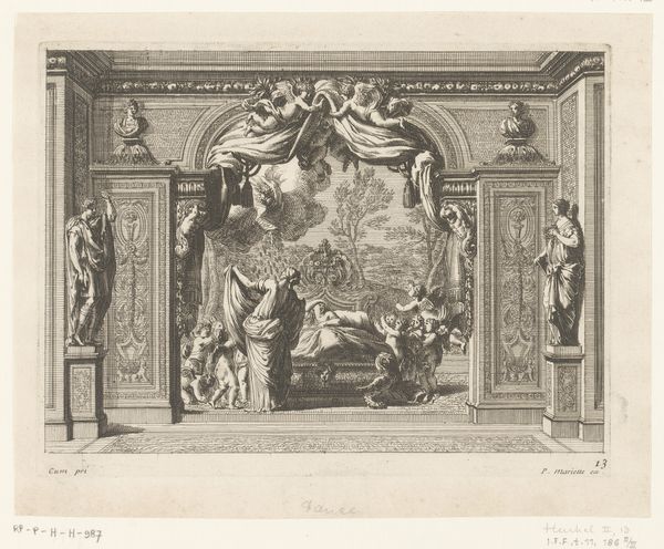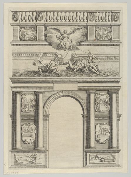Jean Lepautre created this print, ‘Schouw met twee geketende gevangenen,’ using etching. This intaglio process involves coating a metal plate with wax, drawing into it with a sharp needle, and then bathing it in acid. The acid bites into the exposed lines, creating grooves that hold ink. Here, Lepautre demonstrates complete mastery, deploying line of varying density to create a convincing illusion of depth and form. The print’s primary subject, a fireplace, is laden with ornament, its columns, garlands, and figurative sculpture all rendered in astonishing detail. Note the muscular figures, slumped in defeat as they sit chained over the firebox. Lepautre’s virtuosity gives us insight into the culture of the French court during the reign of Louis XIV, a period known for its extravagant display of wealth and power. The print suggests the labor involved in the production of elite interiors, and the politics of subjugation necessary to maintain it. The etching process itself, demanding careful planning and skillful execution, mirrors the broader dynamics of artistic production in the service of social dominance.