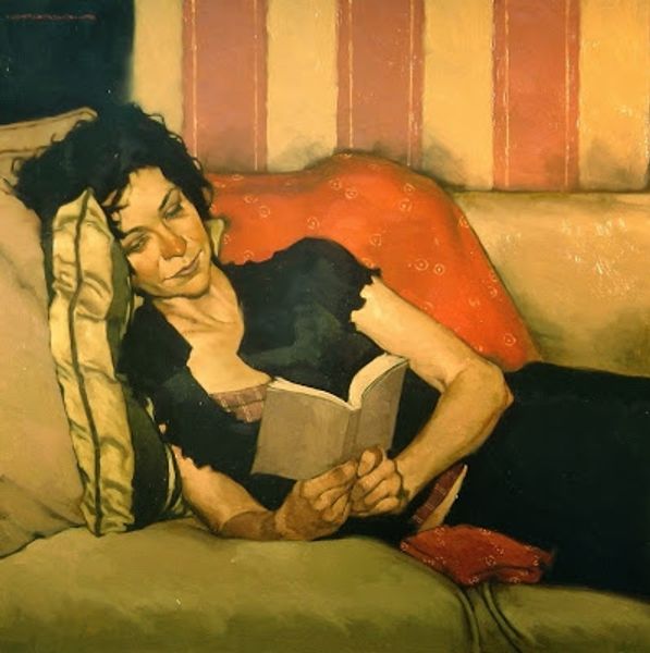 Joseph Lorusso painted "Reading the Sonnet" using oil on canvas. At first glance, the painting envelops the viewer in a warm, intimate atmosphere. The subject, a woman reclining on a sofa, is bathed in soft light, which emphasizes the textures of the fabric and her skin. The composition is structured around the diagonal line of her body, creating a sense of relaxed repose. Lorusso’s brushwork is loose and painterly, which adds a tactile quality to the scene. The interplay between light and shadow is particularly striking. The light doesn't just illuminate; it sculpts the forms, accentuating the curves of her body and the folds of the sofa. Note how the muted palette of ochre, sienna, and crimson creates a harmonious visual experience. The act of reading, is not simply about narrative but how we engage with and interpret the world around us through language and art. The painting challenges fixed meanings, inviting us to consider the subjective nature of experience.