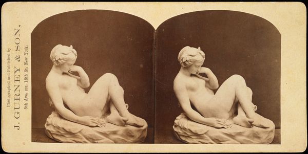 Editor: Here we have an anonymous sculpture captured in a photograph, titled "Sculpture of Two Children and a Cat," dating from somewhere between 1855 and 1880. There’s a definite sense of Victorian sentimentality. What's your take on this piece? Curator: This image provides a window into 19th-century ideals about childhood, but let's not accept that view uncritically. How does it speak to notions of innocence and gendered roles within a rapidly industrializing society? The presence of the cat is interesting—how might we consider the role of pets in defining domesticity and family structures at that time, particularly for the bourgeois class who would have consumed images like these? Editor: That's a perspective I hadn't fully considered. I guess I saw it more as a generic, sweet depiction of childhood. Curator: Exactly! The sculpture itself, meant to be photographed, signifies a move towards mass production of these ideals, doesn't it? Consider the gaze of the children: are they active participants or merely objects to be admired? How might contemporary feminist theory dissect the power dynamics inherent in this representation? Is this simply an innocent tableau or a carefully constructed narrative reinforcing specific societal values? Editor: So, you're suggesting that even a seemingly innocent sculpture and photograph like this can reflect and reinforce potentially problematic power structures of the time? Curator: Precisely. By examining the historical context and applying intersectional lenses, we can begin to unravel the layers of meaning embedded within such images, recognizing how they actively shape our understanding of gender, class, and childhood. Editor: That makes so much sense. I'll definitely look at these types of images differently now! Curator: Remember, art is never neutral; it's a product of its time, reflecting and influencing the society that creates it. Let's keep questioning the narratives we see.
