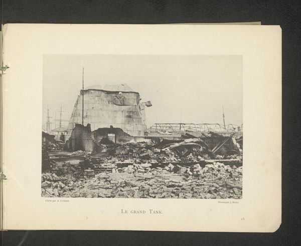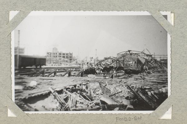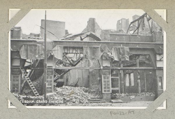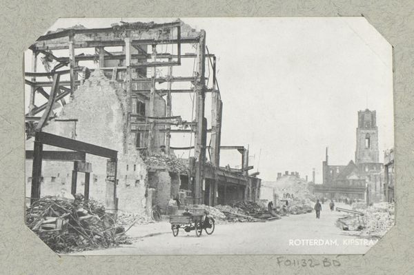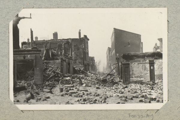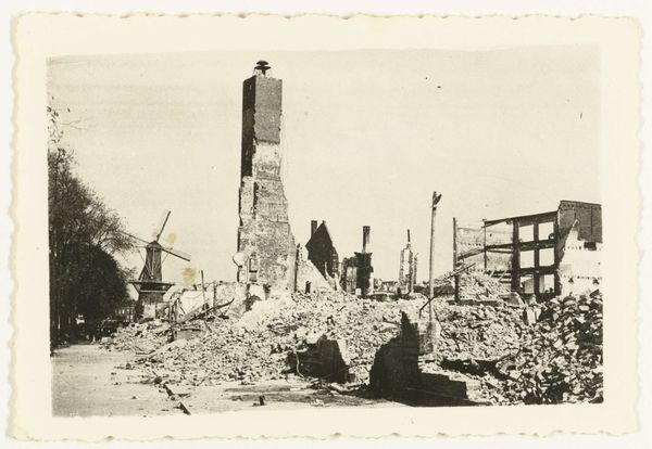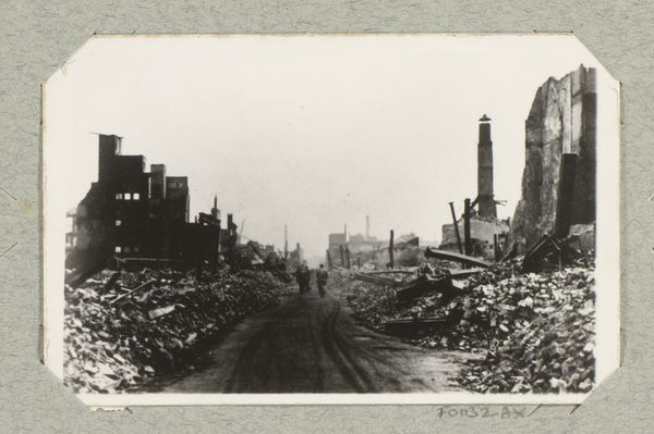 Curator: This is "Gezicht op ruïnes van gebouwen aan de Botersloot te Rotterdam," a photograph by J. Nolte, dating from between 1940 and 1945. Editor: It's a really striking image; the greyscale palette really emphasizes the destruction and evokes a somber, heavy mood. What structural elements do you find most compelling? Curator: I find the use of linear perspective and the stark contrast between light and shadow most effective. The converging lines of the street draw the eye deep into the frame, towards the obliterated architecture. The monochromatic palette further enhances the structural damage. Note how the arrangement of debris creates these angular, fractured forms, challenging conventional notions of architectural beauty. The interplay between the remaining solidity and complete obliteration of elements seems central to its effect. Does it trigger associations with ideas or philosophical concerns? Editor: It makes me think about the fleeting nature of life, but I'm still grappling with how photography comes into play here. Why photography? Curator: Photography excels in capturing specific details. The focus here accentuates the formal properties. Notice how it renders nuances of light, shadow, texture in the buildings; as Roland Barthes pointed out, the "punctum," the wounding detail, has tremendous power in photography. Editor: So the 'punctum' here might be rubble itself; I appreciate your perspective on composition and lighting. The visual experience is profound, even divorced from its historical context, in a strange way. Curator: Yes, the devastation reveals form; in a sense it's reductivist: It strips things down. Understanding that is essential to decoding much Modern Art. Editor: This has totally changed how I look at this work! I'm grateful for your deep knowledge on this artwork. Curator: And I yours: together we discovered that what makes the image stand out is a synthesis between form and the destruction we see before our eyes.