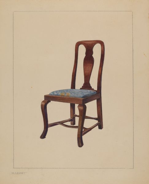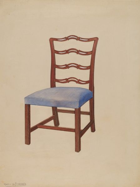 Curator: Before us, we have a watercolor drawing titled "Armchair" created by Virginia Kennady in 1939. Editor: It's striking in its simplicity; the muted colors and direct representation of a familiar object create a calm, almost nostalgic feel. Curator: This piece speaks to the WPA Federal Art Project, an initiative that employed artists during the Great Depression. We see an embrace of realism focused on everyday subjects. The materials, humble watercolors, remind us of resourcefulness in a difficult time, offering a direct connection to a specific historical and social context. Editor: And the composition is masterful; the chair occupies the space perfectly, allowing our eye to appreciate the intricate details of its form and material, like the elegantly curved back and the subtle variations in wood tone. There's a pleasing geometric harmony between the angular legs and the curvilinear backrest. Curator: Absolutely. Examining its construction reveals values associated with labor and utility. What kind of craftsman assembled this? From what specific location were these wooden materials procured? Those details become fascinating entry points. Editor: The limited palette—earthy browns and greys—is very effective. It's not just about the wood; it's about creating an emotional presence for a mass-produced artifact, in a subtle, unpretentious way. We tend to underestimate such seemingly simple images but this work truly exudes compositional clarity, doesn't it? Curator: This seemingly simple image of a utilitarian object asks deeper questions regarding production, labor, and consumption under extraordinary economic conditions. The artist’s labor intersects directly with larger questions of artistic production in a period of immense social upheaval. Editor: It’s incredible how something so commonplace, carefully observed and represented, transcends mere objecthood through its very form. Its clarity helps to slow us down. Curator: Right. The materials tell such a strong story here. Editor: And its elegant contours keep that story compelling.