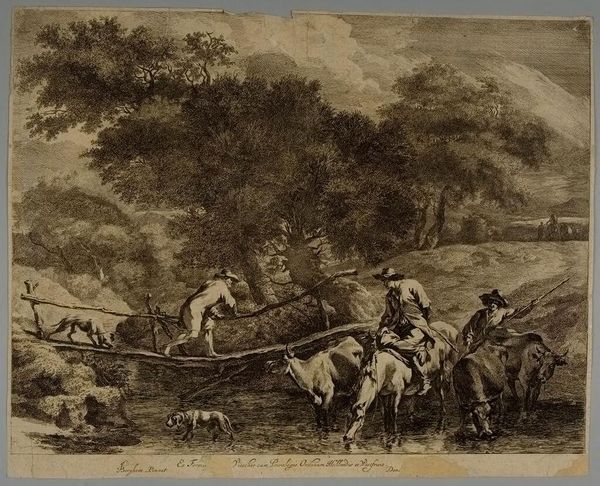 Dancker Danckerts created this print titled 'Morning' using etching techniques. The composition of the image invites us to read it from left to right, following the figures as they navigate the landscape. Notice how the stark contrast between light and shadow emphasizes the figures and the bridge, drawing our eyes to the movement and activity within the scene. The textures, achieved through the fine lines of the etching, create a tangible sense of depth. Danckerts uses formal structure to represent an idealized view of rural life that emphasizes an idea of order and harmony. This structured view invites us to consider how art can shape and frame our understanding of the natural world. Art is not merely a mirror reflecting reality but is a construct that carries cultural and philosophical meanings.